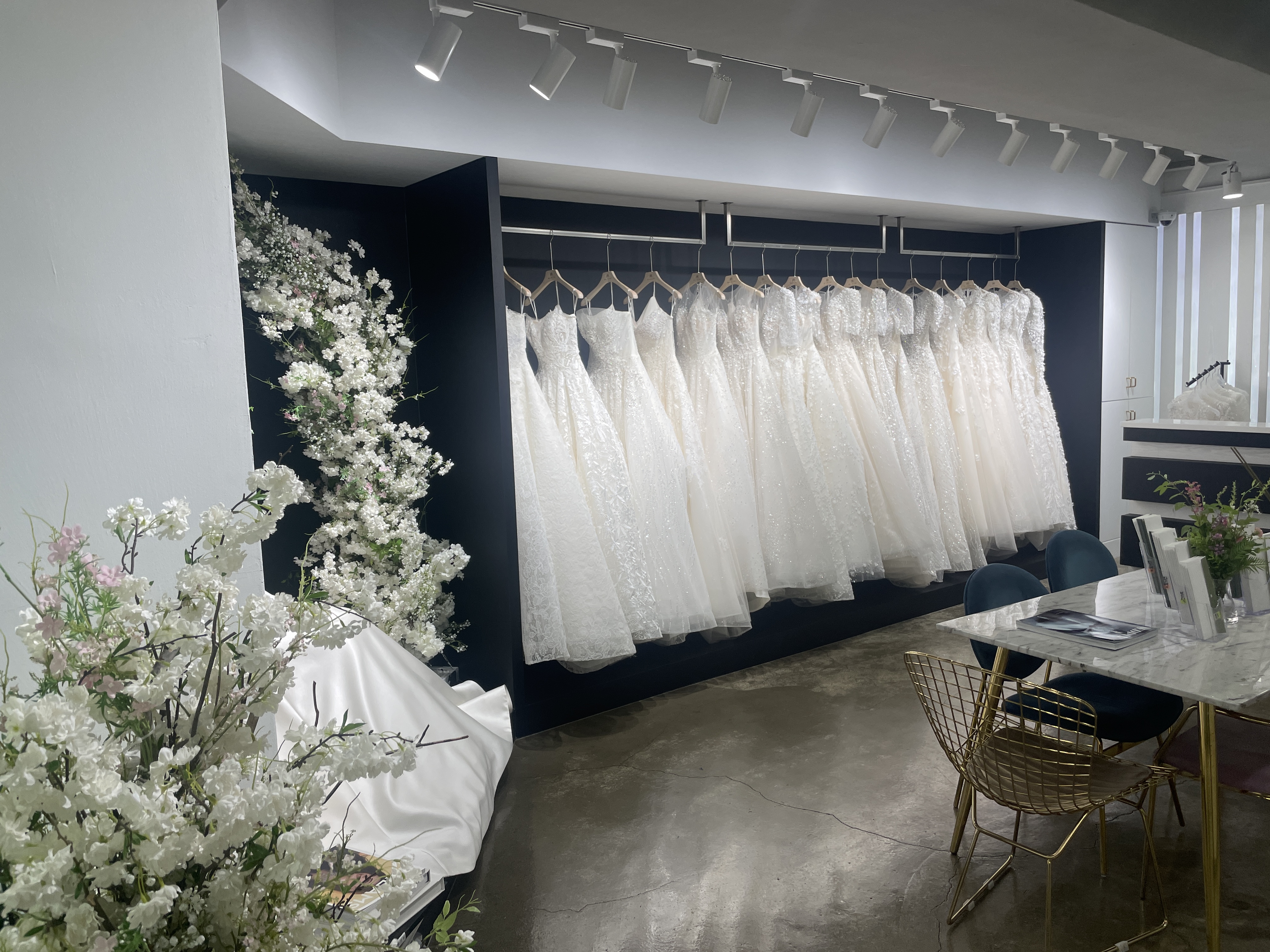 대기없이 바로 올라갔습니다. 피팅룸과 대기실이 바로 코앞이었습니다. 멀리서 보다가 가까이서 보니까 자세히는 볼 수 있지만 하객의 입장으로 보기는 어려웠습니다. 그리고 화려한 것보다는 무난한 종류가 많아서 가성비가 중요하신분들은 괜찮으실 겁니다!! 에어컨에 걸려있는게 슬립! 무엇보다 가장 늦게까지 하는 샵인데 3번째 간곳이라 기력을 모두 소진했어요. 코르셋을 특히 많이조이는 곳이라고합니다