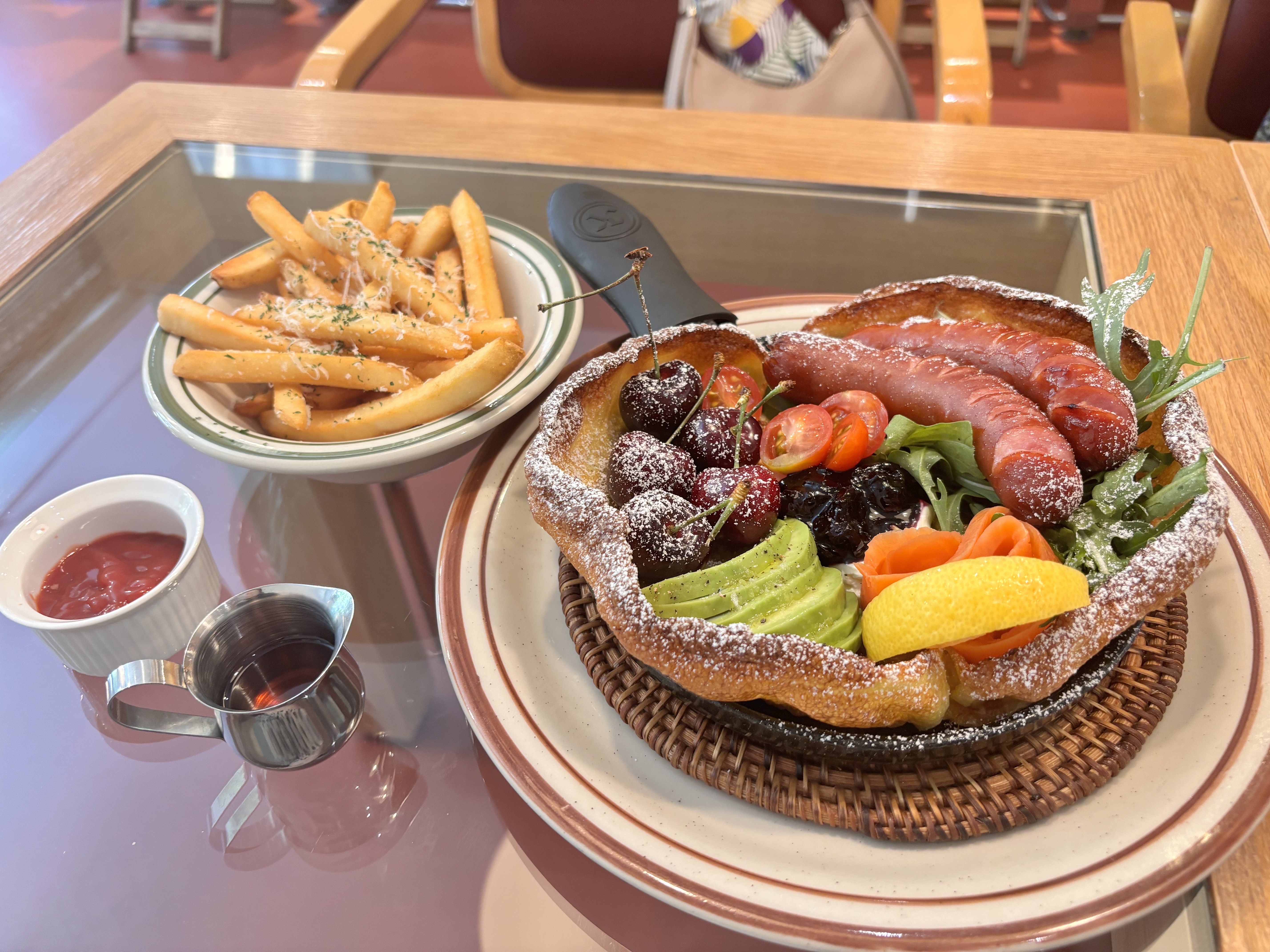 이름도 어려운 더치베이비 팬케이크입니다. 사실 하몽이 올라가는 피자를 시키려고 한 건데 샐러드페이지에 있어서 잘못시킨 거예요. 독일음식으로 얇은 팬케이크 안에 훈제연어, 아보카도, 체리, 토마토, 소시지, 루꼴라, 블루베리크림치즈리플잼, 메이플시럽을 토핑 한 메뉴입니다. 감자튀김이 사이드메뉴로 나와요. 시럽을 뿌려서 밑에는 축축하고 옆면은 바삭하면서 질겨서 나눠먹기는 힘들었습니다. 그래도 달달하고 골라먹는 맛이 있고 누가 봐도 사진용이라 좋습니다. 저기서 연어 빼고 다 맛있었어요. 연어는 좀 비려요.
