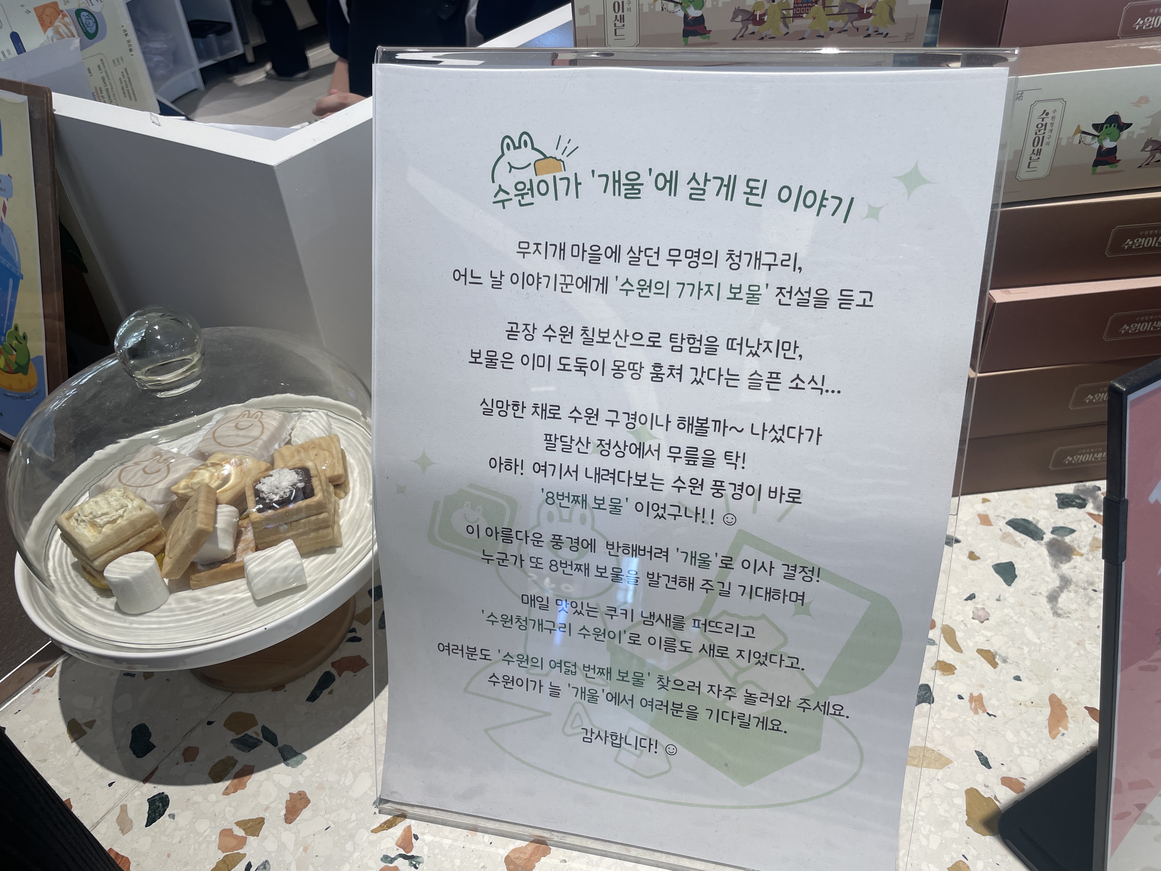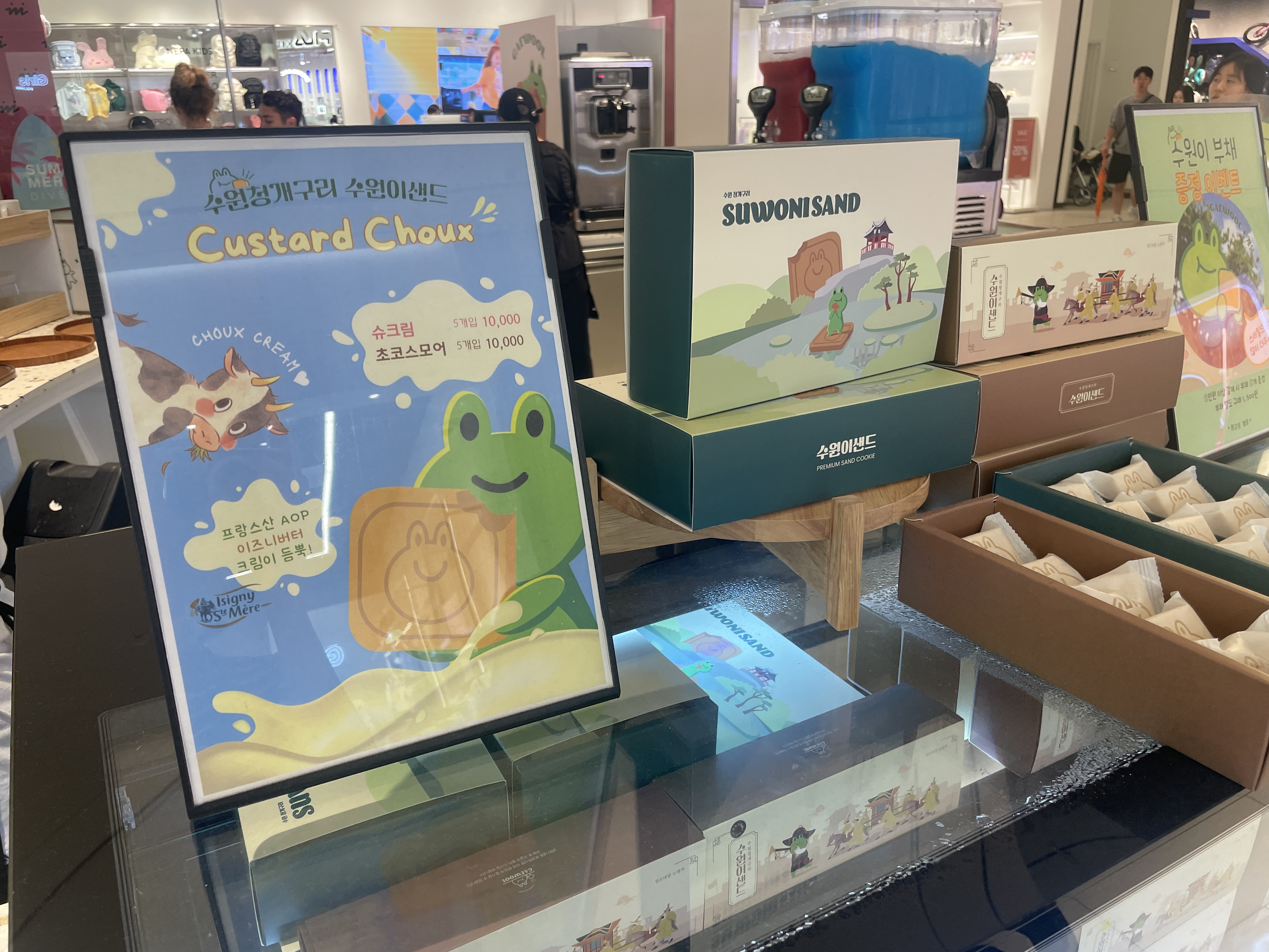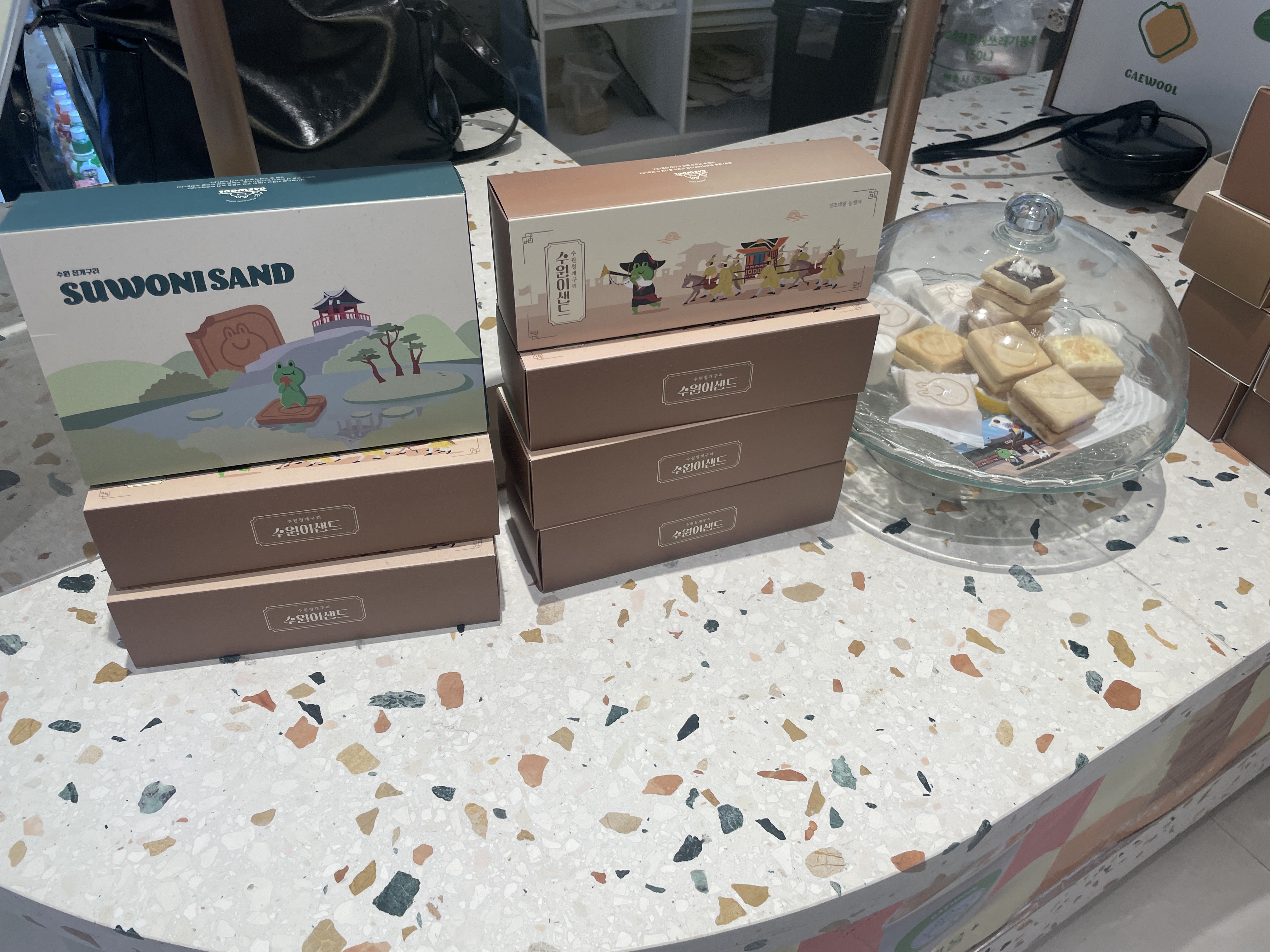 수원 행궁동 기념품인 수원청개구리 수원이샌드인데 10개입 18,000원입니다. 슈크림 or 초코스모어 선택입니다. 5개입은 만원이래요.