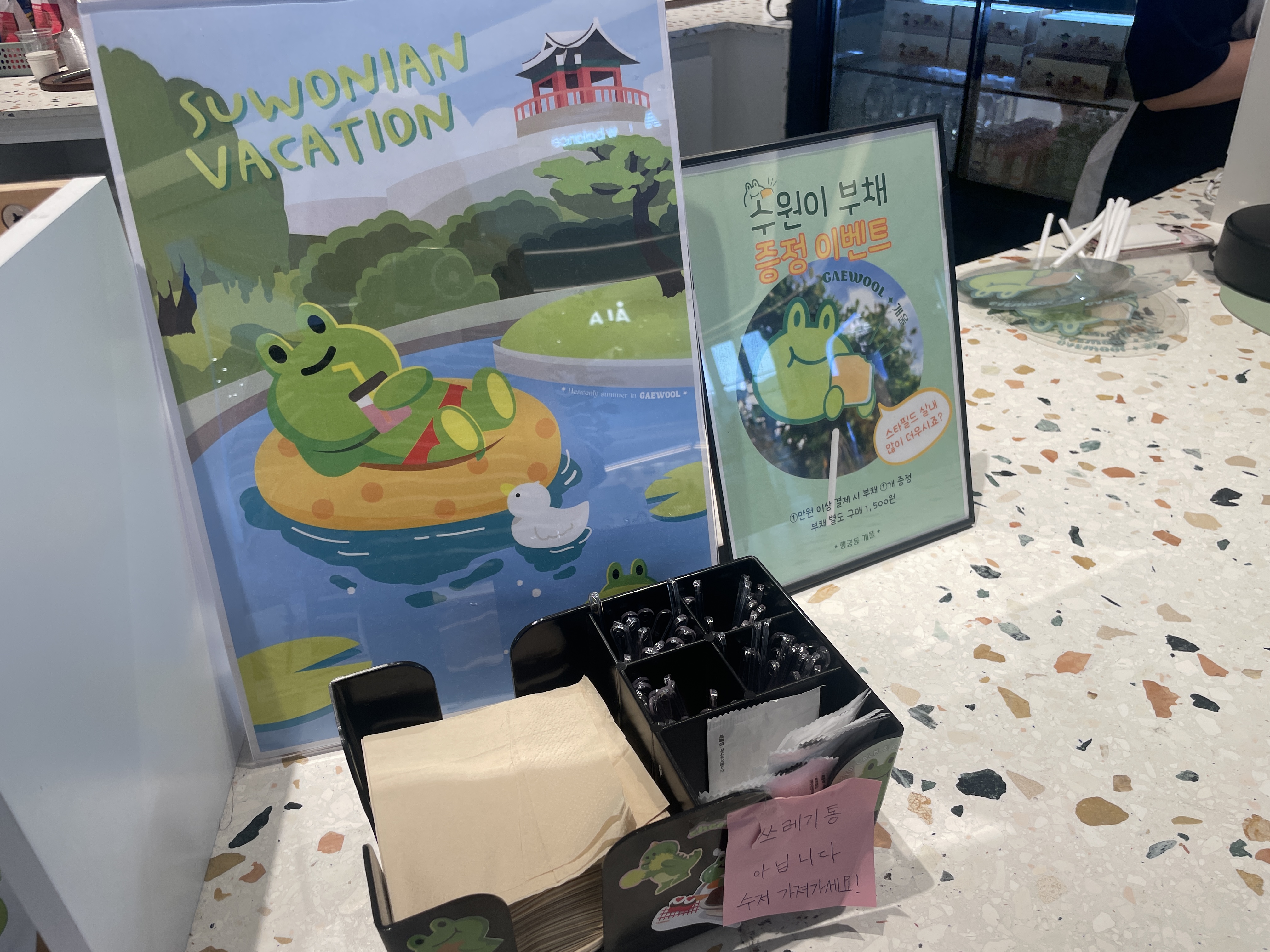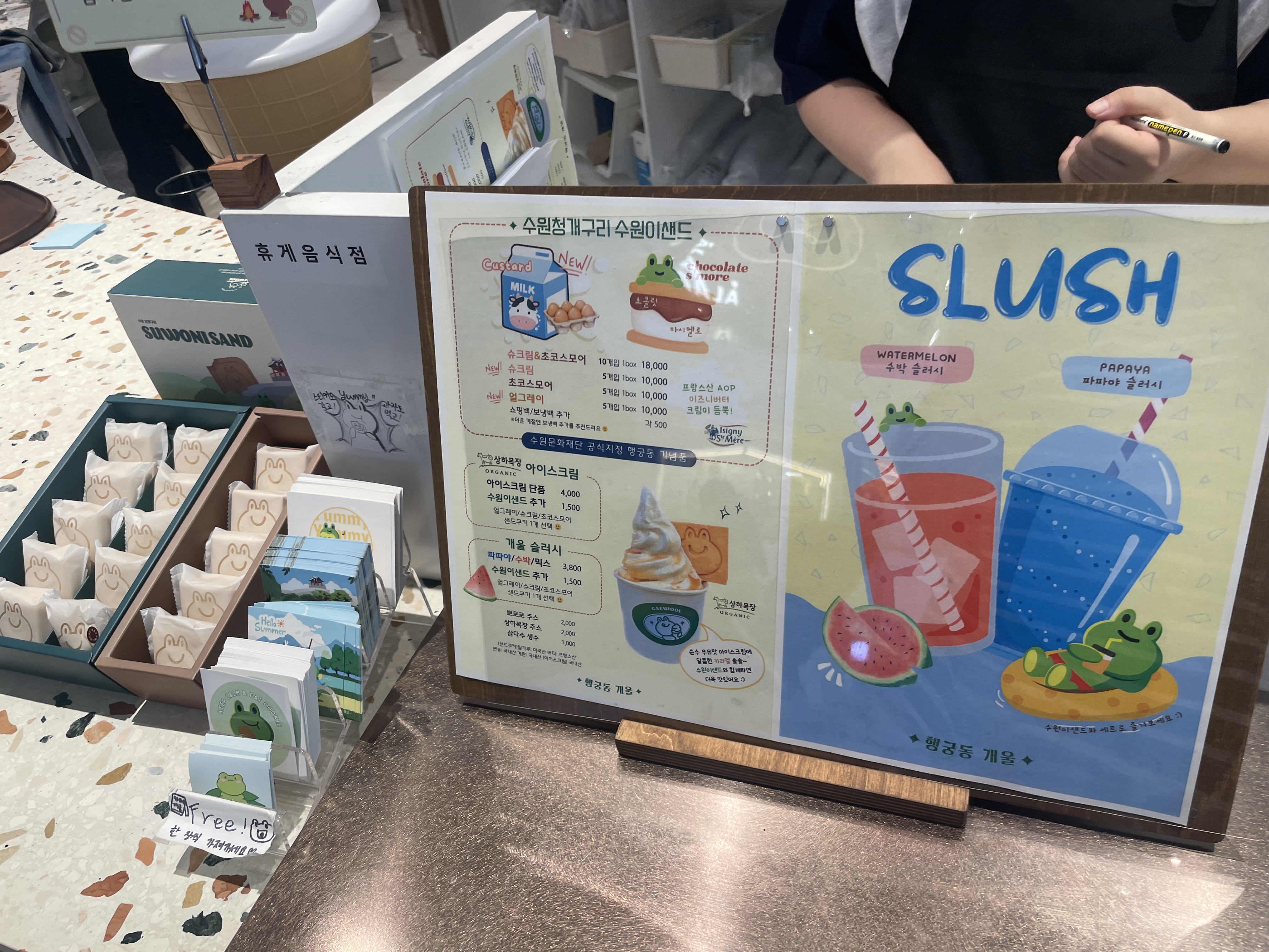 아이스크림 4,000원에 1,500원을 추가하면 수원이 샌드를 올려줍니다. 저는 빼고 캐러멜시럽만 추가해서 먹었어요. 생각보다 맛있었어요. 먹고 나서 우유비린내는 어쩔 수 없지만요. 아이스크림 사진은 제 뱃속에 있습니다 ㅎ..
