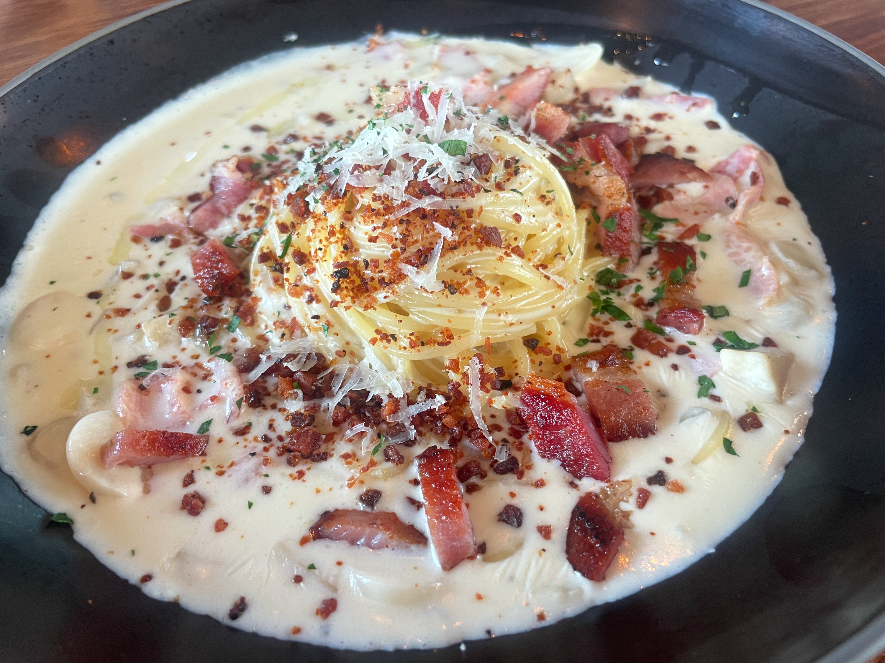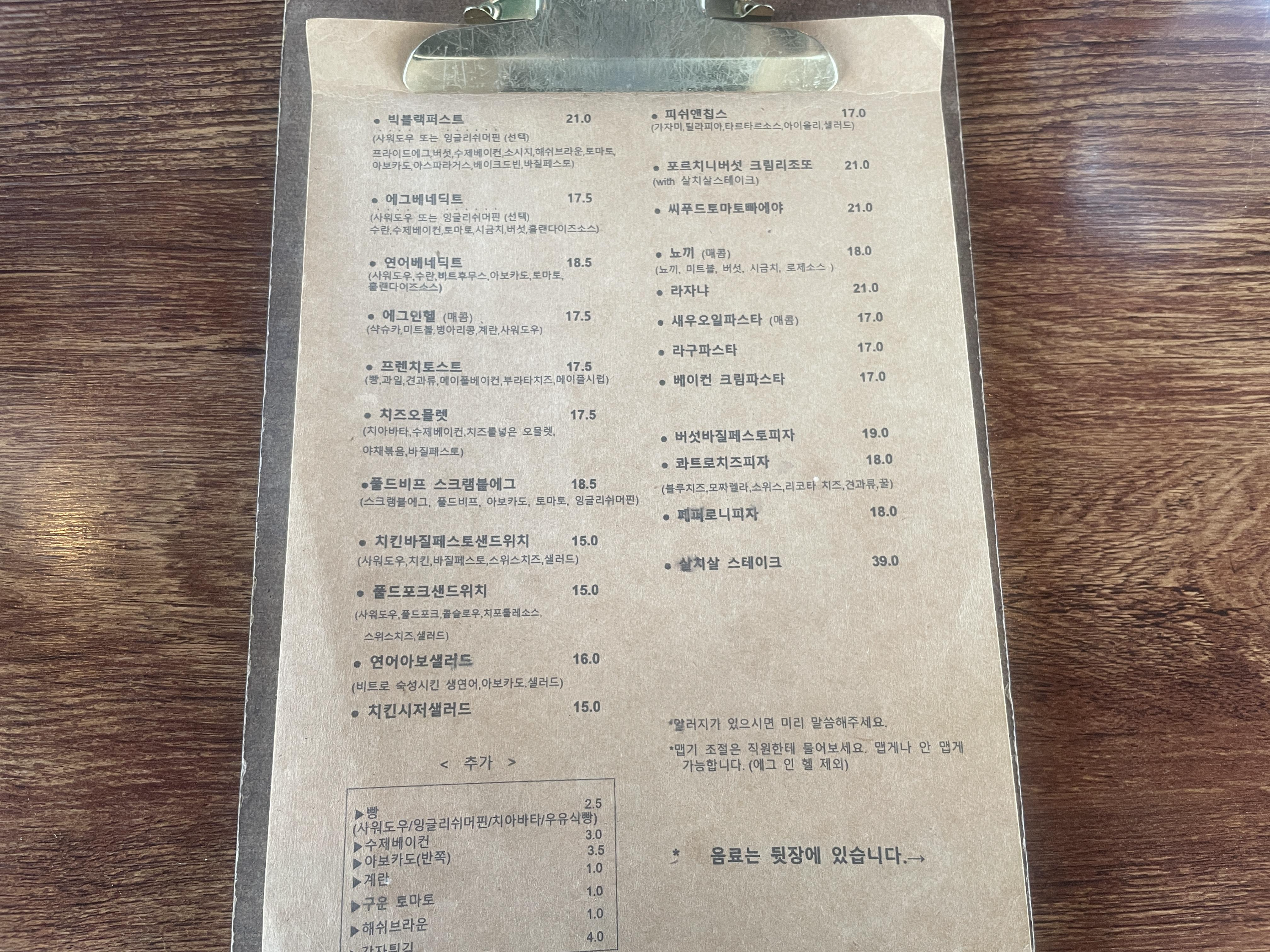 그렇게 기다려서 받은 음식이 맛있으면 다행인데요. 베이컨크림파스타는 괜찮습니다. 약간 묽은감이 있고 크림파스타가 어쩔 수 없는게 먹다보면 느끼한 부분이 있어요. 무난한 맛이긴한데 먹으면서 바로 옆에 있는 사생활 크림파스타가 생각났어요.. 차라리 사생활을 재방문 할 걸 그랬습니다.