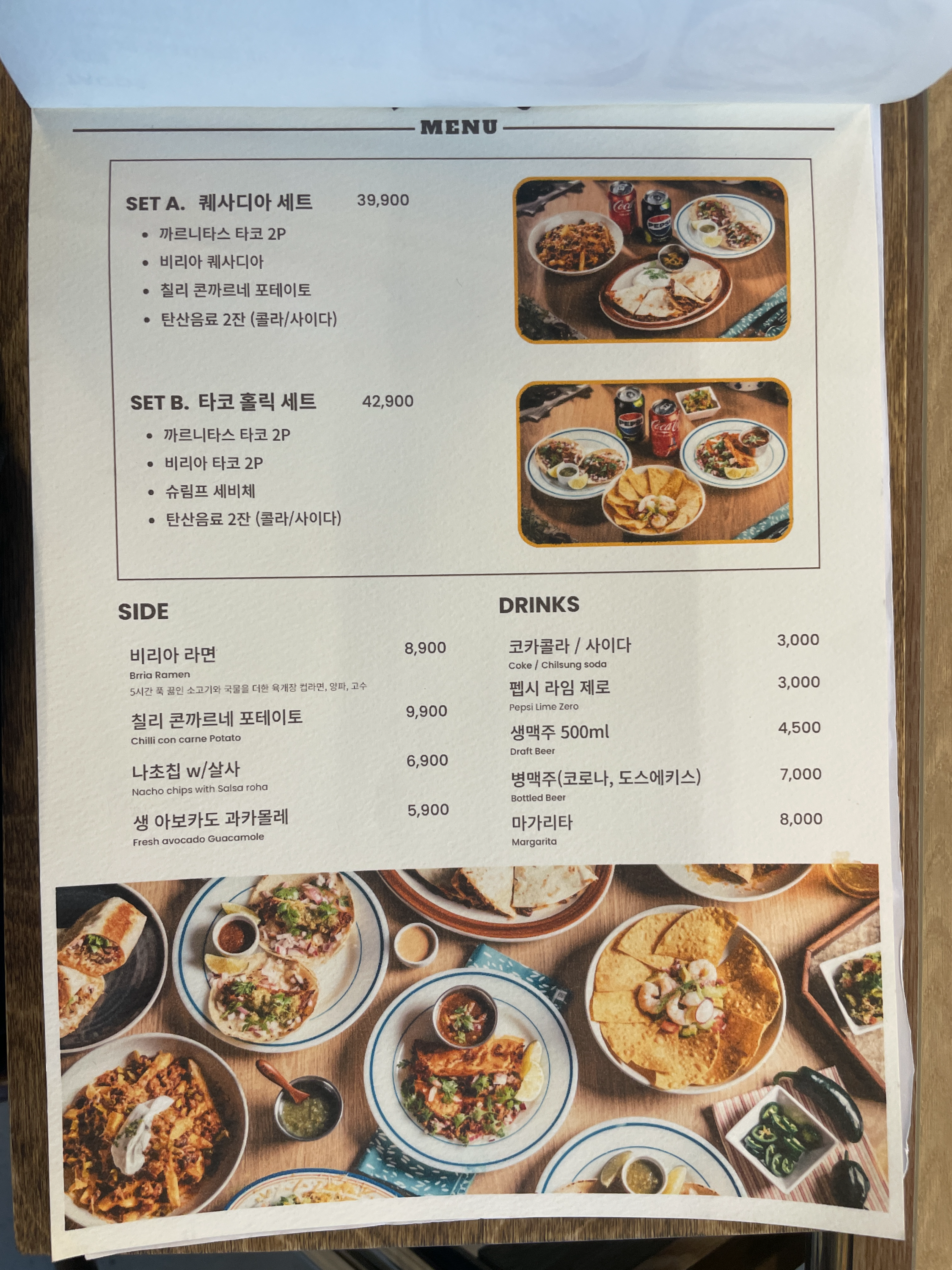 (까르니타스 타코 2P+비리아 퀘사디아+칠리 콘까르네 포테이토 + 탄산음료 2잔)