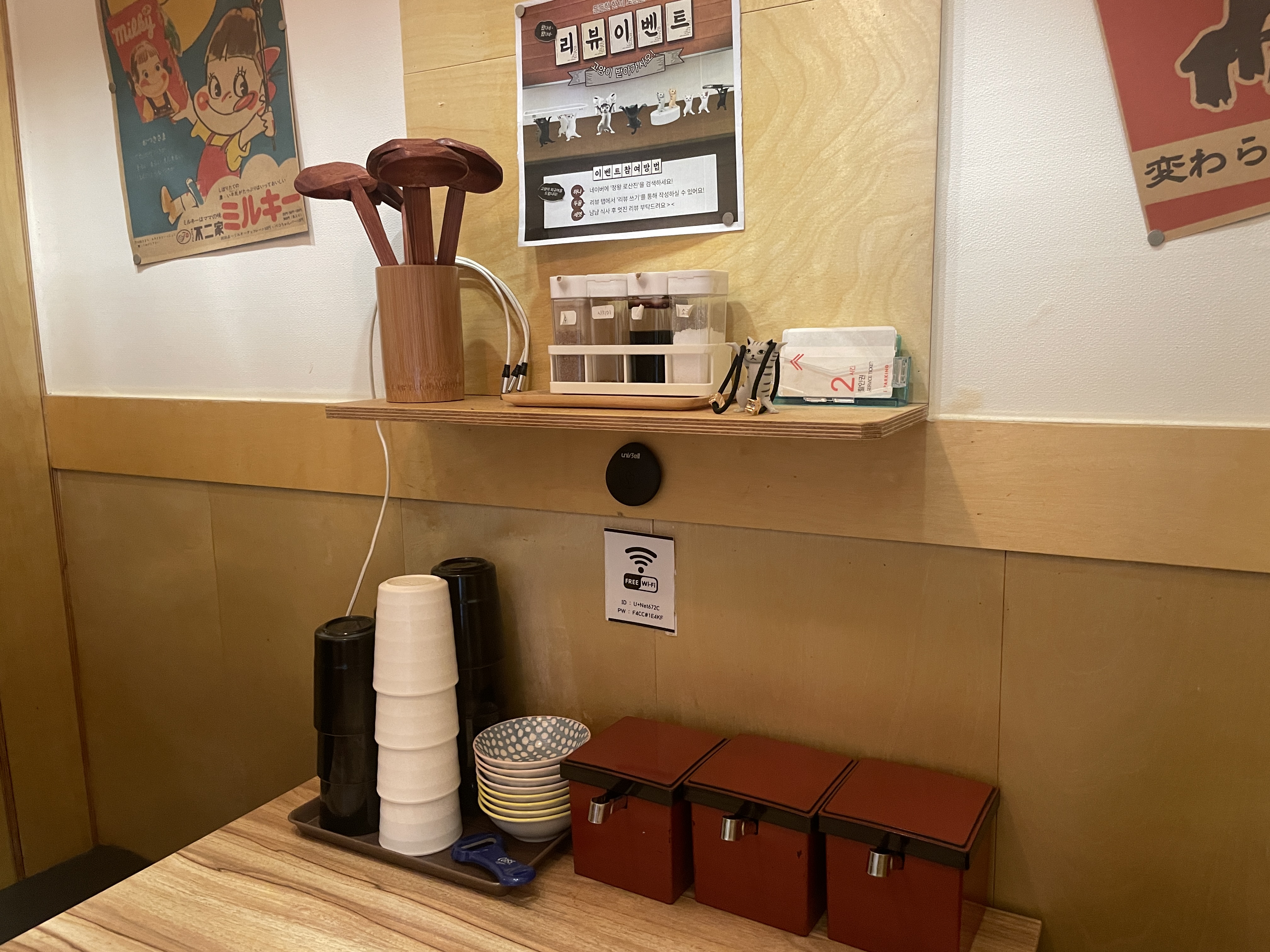 리뷰 작성하시면 고양이피규어를 준다고합니다. 그 외 후추, 시치미, 간장, 소금, 머리끈, 주차권이 벽선반에 있습니다. 그 밑으로는 김치, 알수없는 나물장아찌, 단무지가 있어요.