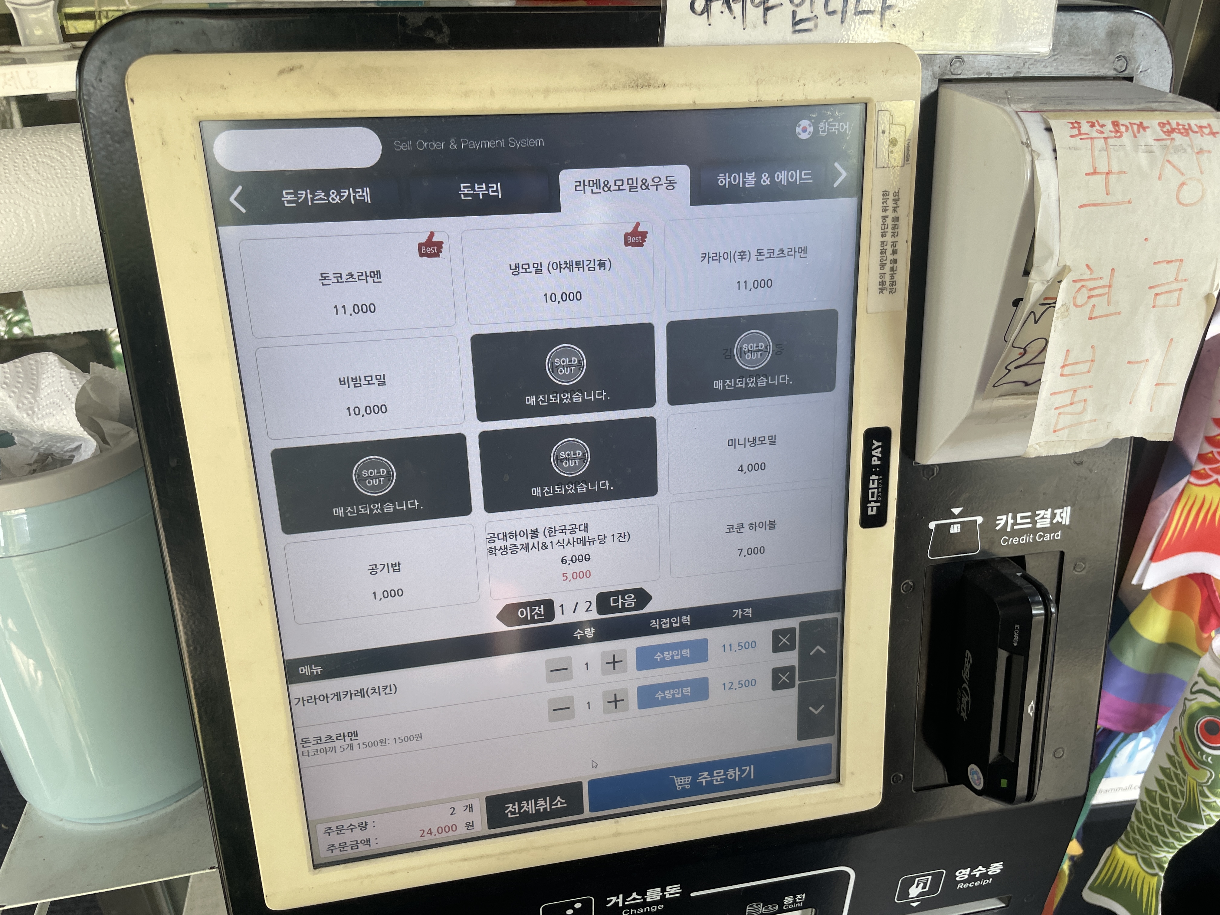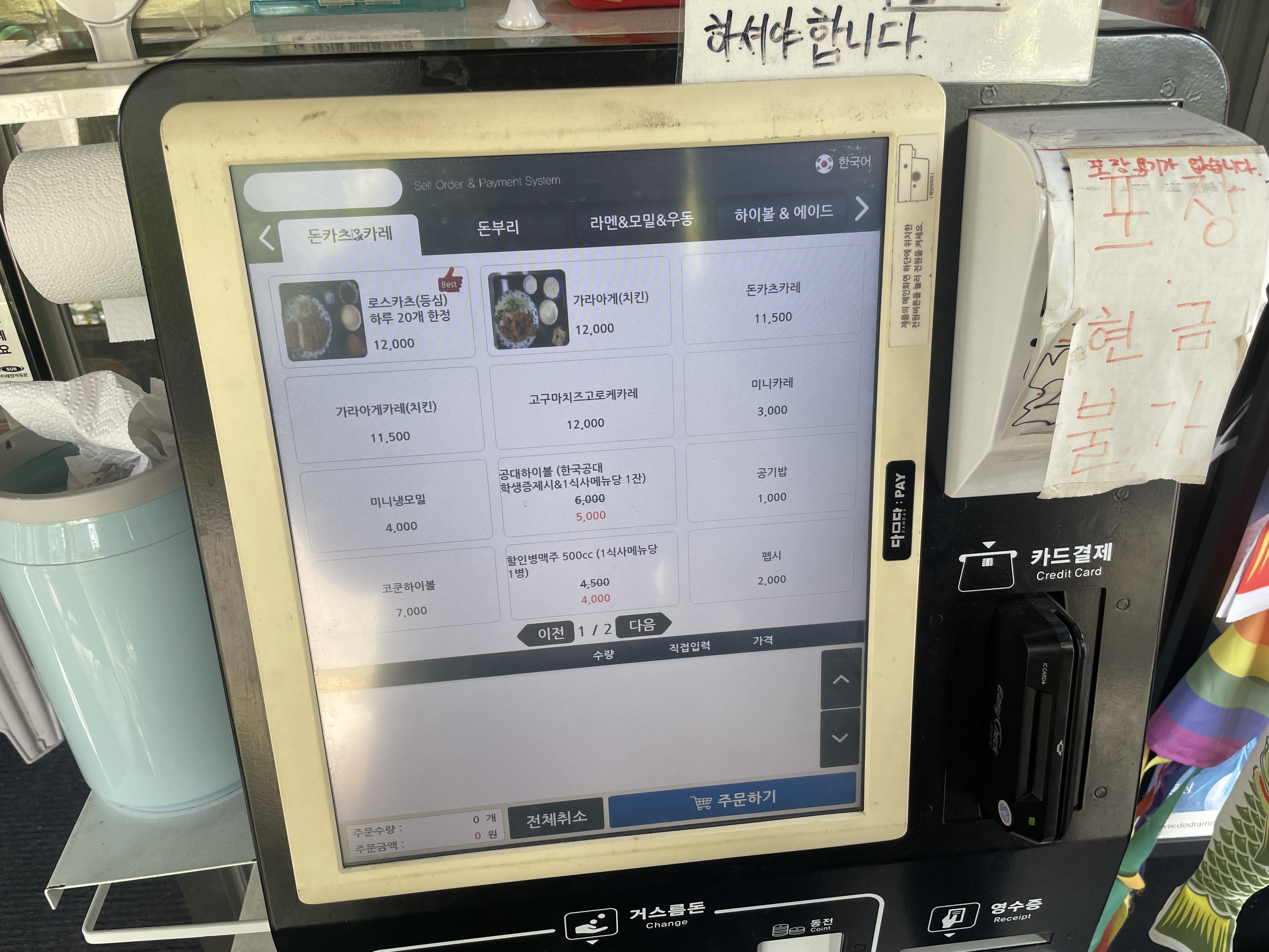 입구에 바로 들어가면 키오스크가 보입니다. 터치가 잘 안되지만 인내심을 갖고 주문을 해봅니다. 참고로 현금이나 포장은 불가능해요!