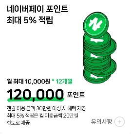 - 네이버페이 포인트 20만원 한도 내 최대 5%적립