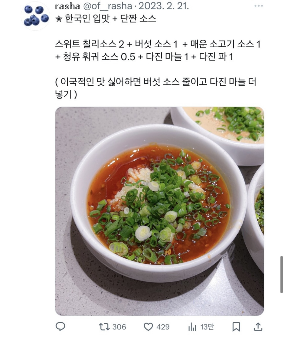 * 한국인 입맛 소스 : 스위트 칠리소스 2+버섯소스 1+매운 소고기소스 1+청유훠궈소스 0.5+다진마늘 1+다진 파 1