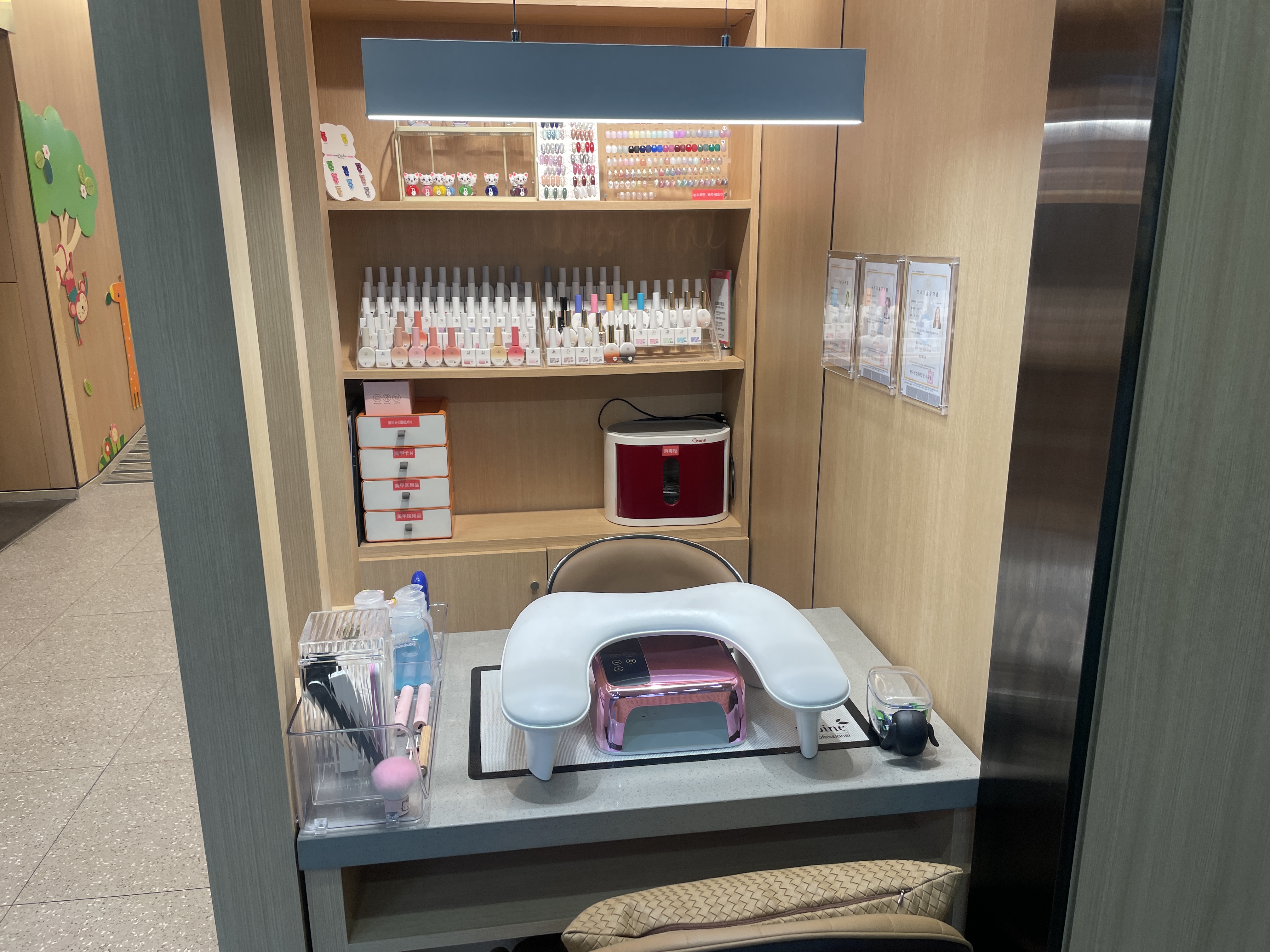 공휴일 오픈 런+예약하고 갔는데도 여러 테이블이 기다리고 있었습니다. 카운터 좌측이 무료 스낵바 우측이 무료 네일샵이에요.