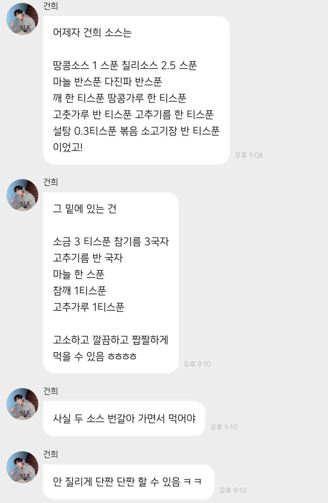 * 원어스 건희소스 : 땅콩소스 1+칠리소스 2.5+마늘 0.5+다진파 0.5+깨 1티스푼+땅콩가루 1티스푼+고춧가루 0.5티스푼+고추기름 1티스푼+설탕 0.3티스푼+볶음소고기장 0.5티스푼
