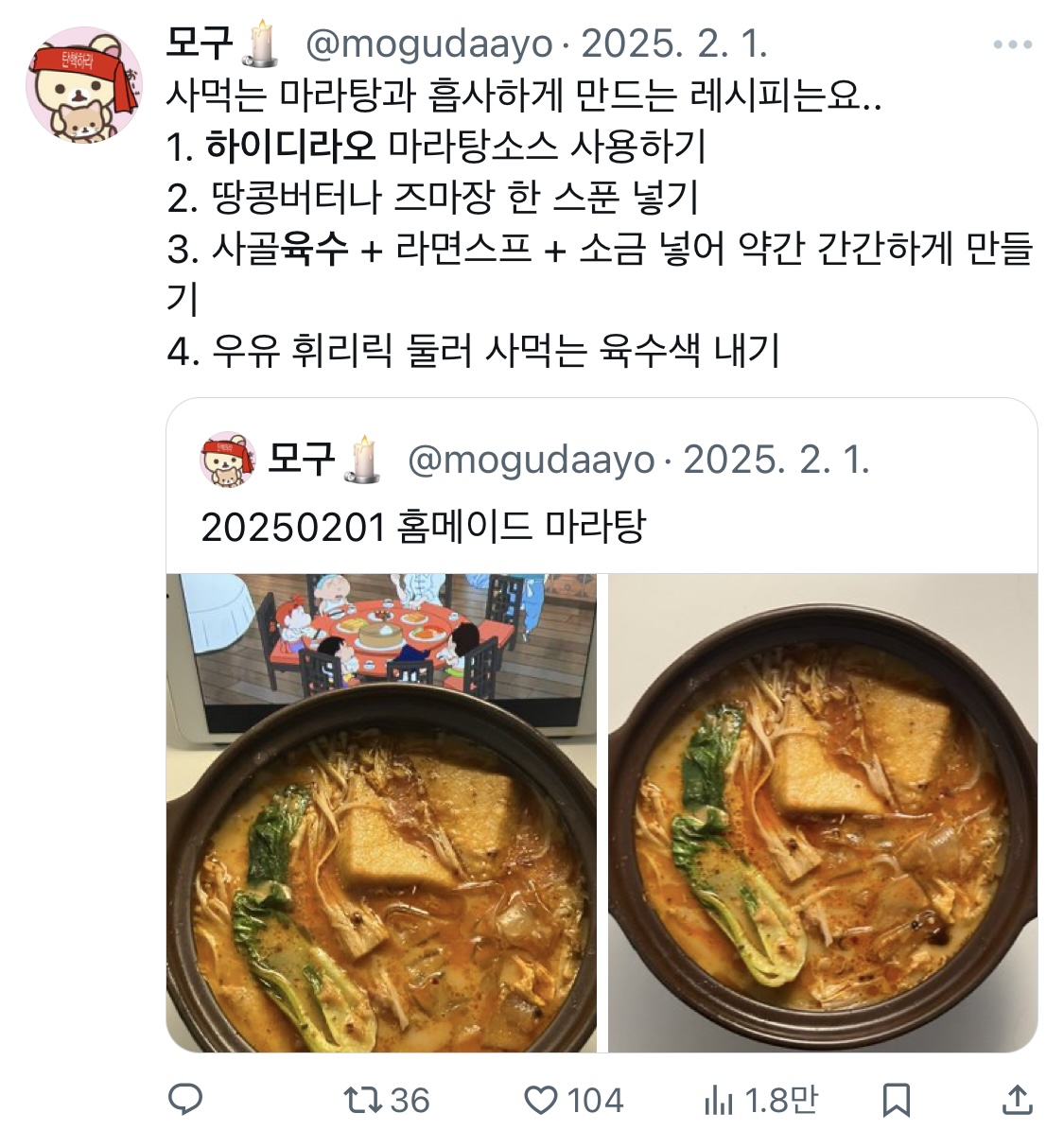 - 홍탕 : 청유마라탕(일반적인 마라), 우유마라탕