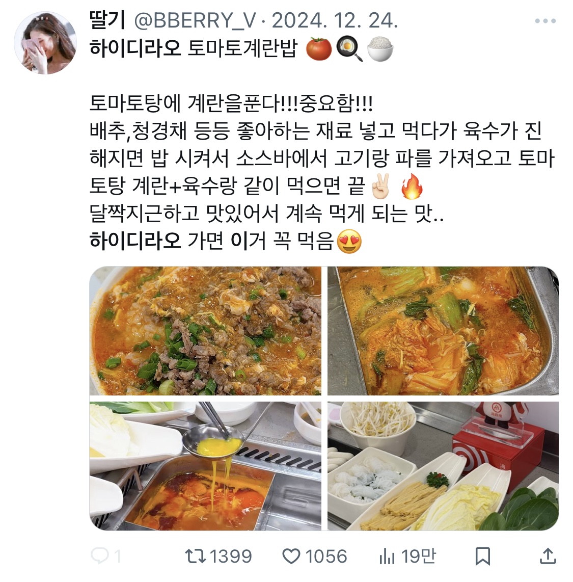 토마토탕에 계란을 풀고, 야채를 넣고 먹다가, 육수가 진해지면 고기,파,계란,육수를 섞어 먹으면 된다고합니다! 저는 토마토탕이 생각보다 슴슴하고 달달해서, 해먹지 않았습니다.