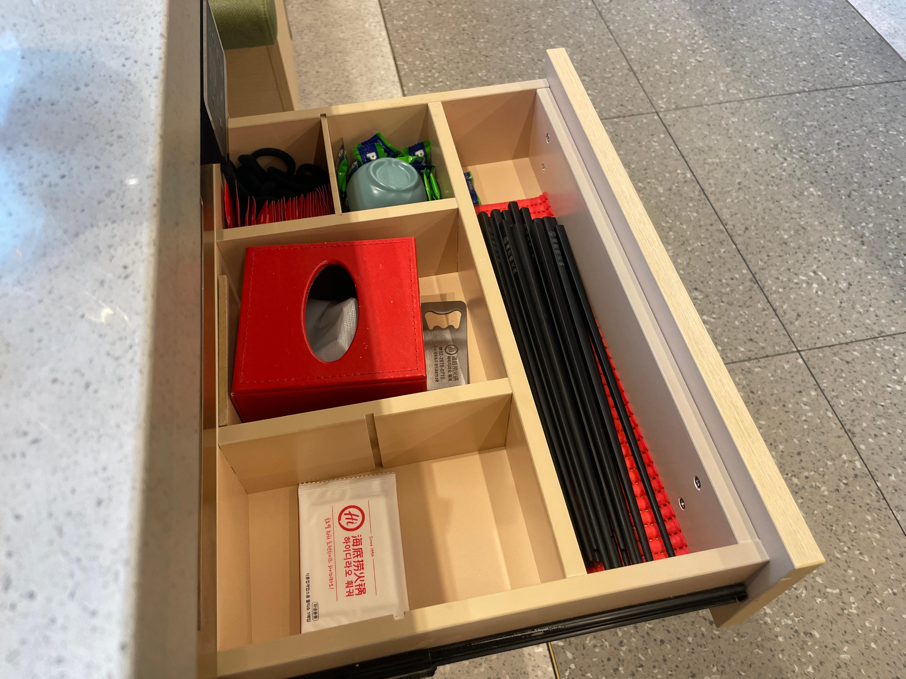 자리에 가면 서랍에 있는 물품이에요. 일회용 소독티슈, 물티슈, 머리끈, 폴로, 집기, 휴지, 병따개 등이에요. 어디는 웰컴스낵을 따로 챙겨준다카더라도 있는데, 영등포 테이블에는 폴로가 다입니다!