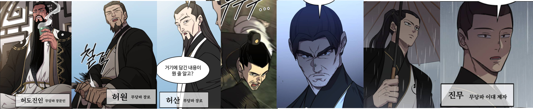 무당파 장문인 허도진인 / 장로 허원 / 허산 / 일대제자 무연 / 무진 / 이대제자 무당검룡 진현 / 진무