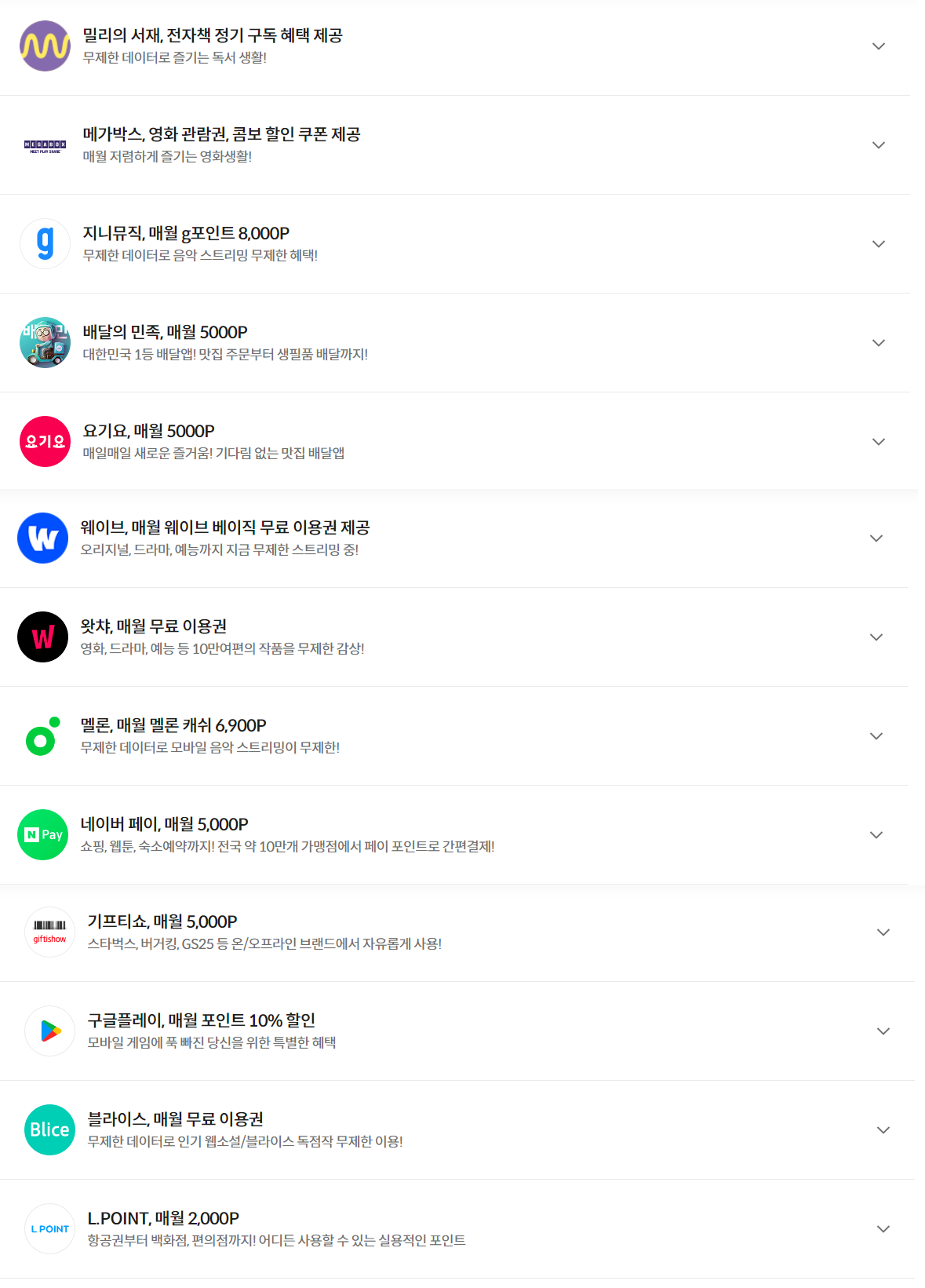 네이버 멤버쉽 / 카카오톡 톡서랍 / 넷플릭스 / 멜론 / 티빙