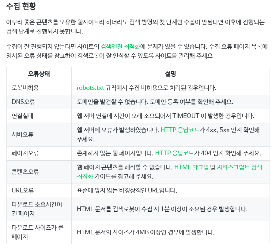 로봇비허용은 서치어드바이저 내 robots.txt 검증에서 재설정하시면되고, 서버오류와 페이지오류는 HTTP응답코드 확인,