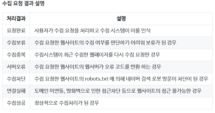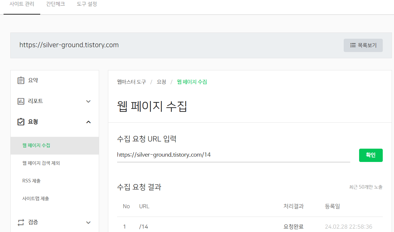 3. 사이트관리 - 요청 - 웹페이지 수집 - 수집요청 URL 입력해줍니다.