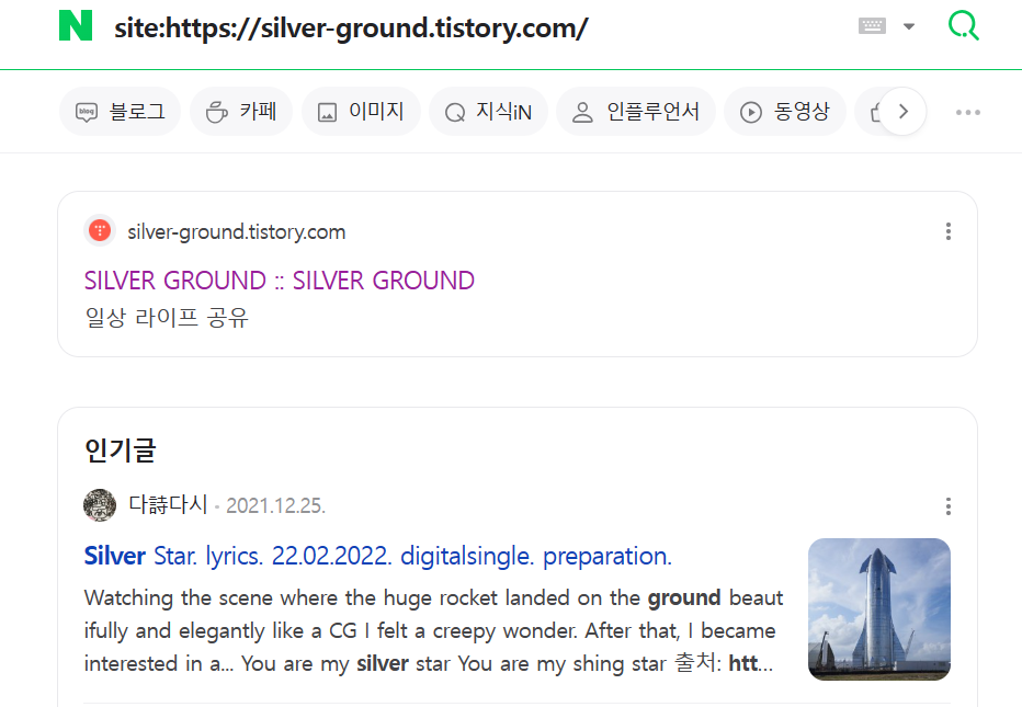 4. 2-3일 뒤 다시 네이버에 "site: 블로그URL"을 검색합니다.