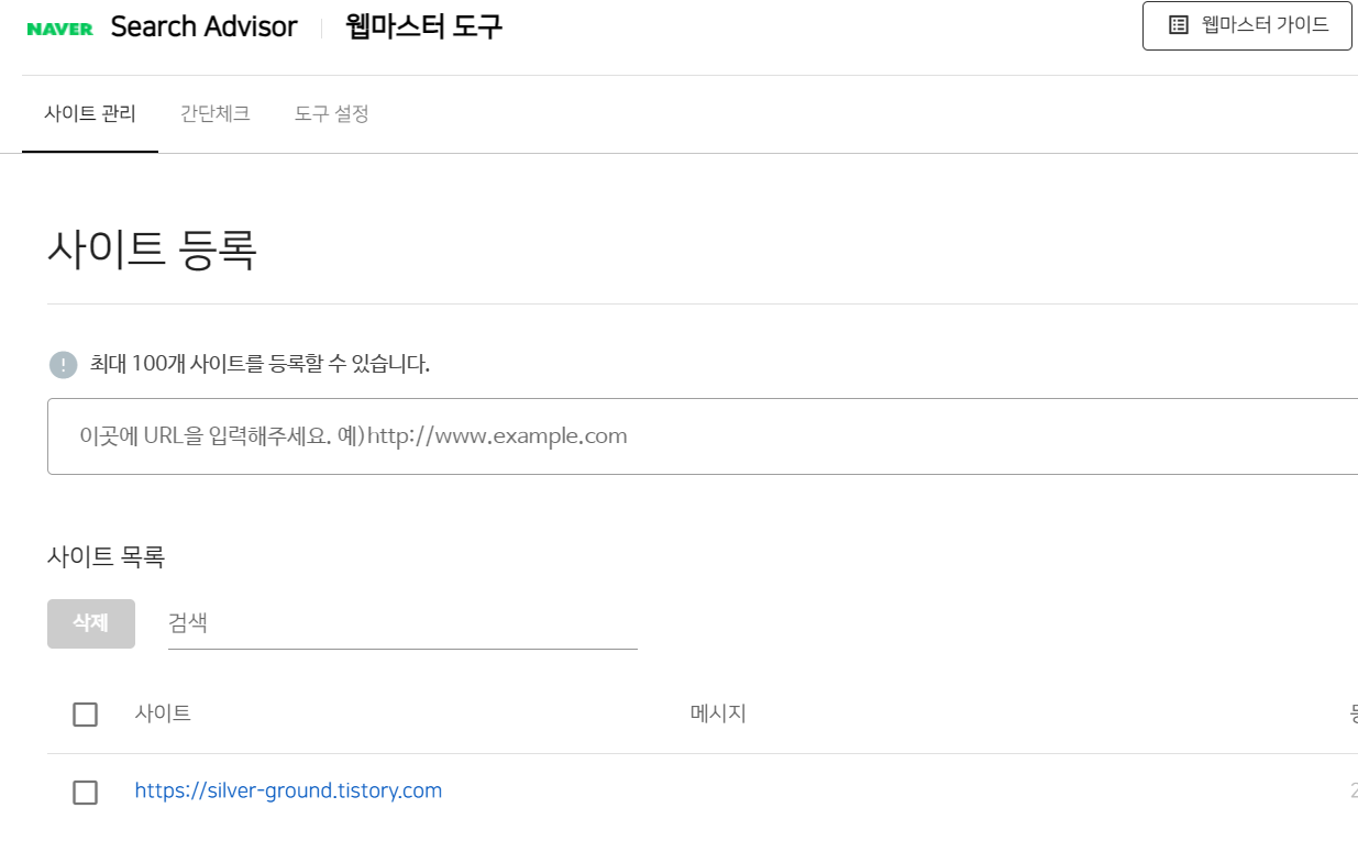 2.웹마스터 도구 - 사이트 관리 - 사이트 등록 - 사이트 클릭
