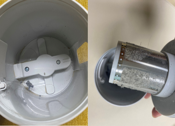 그래도 이게 되기는 하는거야? 싶은 마음에 바로 필터를 분리해봤어요. 머리카락은 안되는데 먼지는 야무지게 빨아들이고 있었습니다. 자 이제 쇼파에 테스트 마쳤으니 이불도 청소하러갑니다