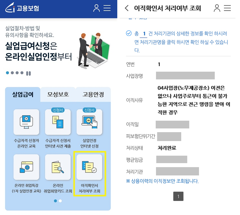 사업자가 처리를 완료하면 조회되며 이직사유도 잘 기입되었는지 확인이 가능합니다.