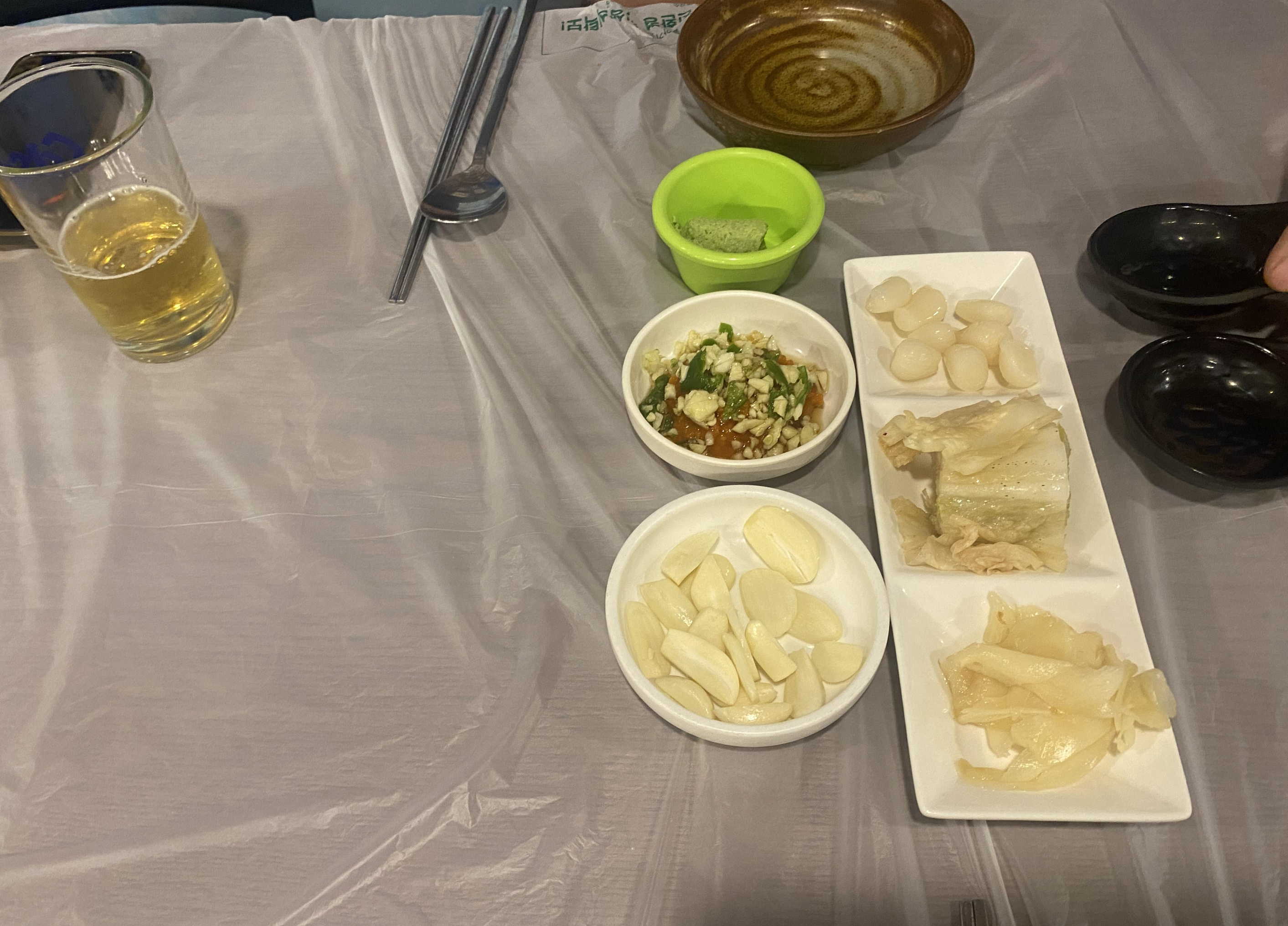 기본 반찬입니다. 물과 술은 셀프인점이 조금 아쉬웠습니다. 식당에서 드신다면 무조건 술냉장고 근처로 앉으세요!