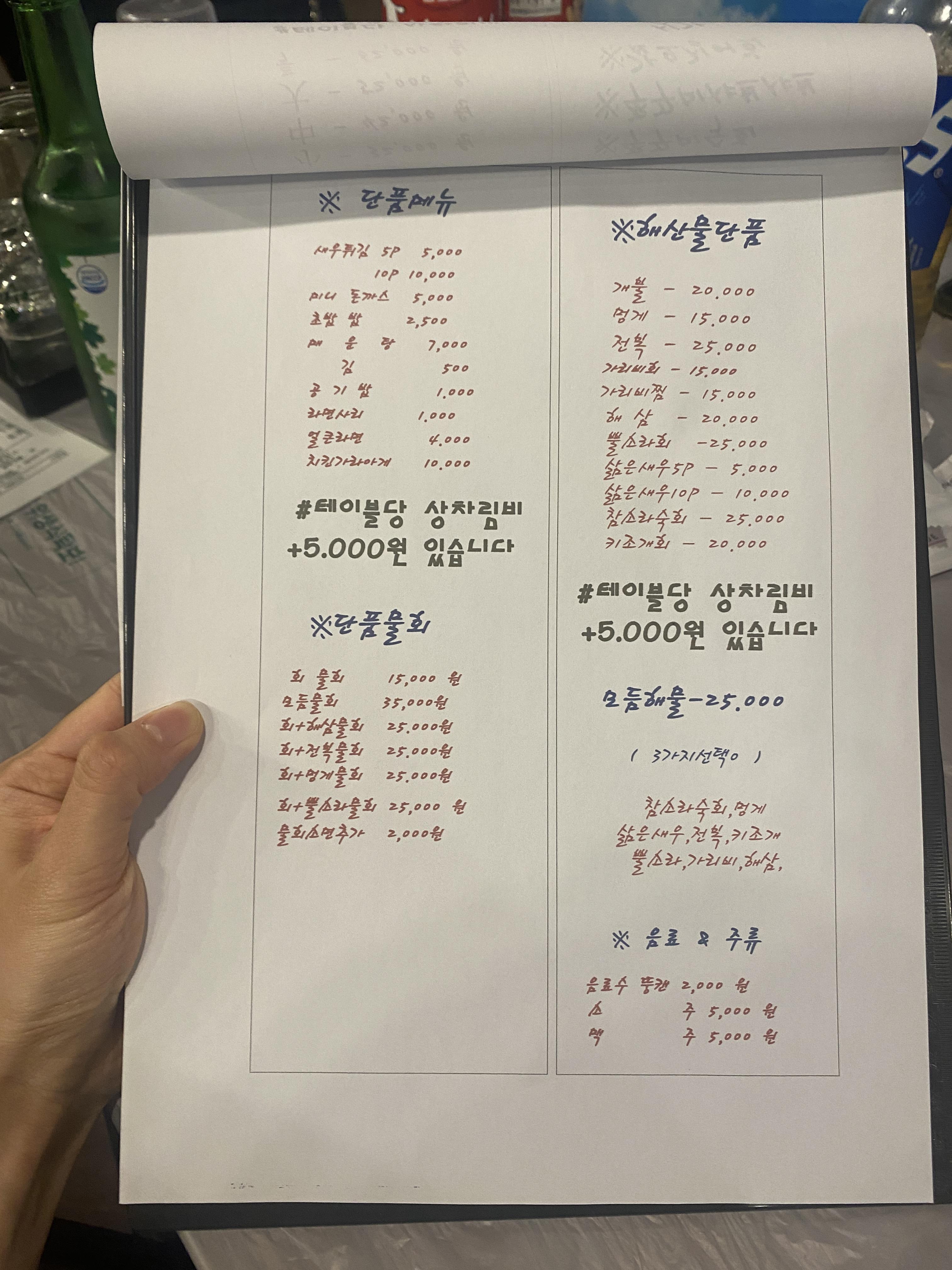 제가 또 도다리 귀신아니겠습니까. 묻지도 말고 따지지도 말고 도다리 중자로 골라줍니다. 희봉이네는 배달맛집이라 식당에서 먹을 경우 상차림비가 테이블당 5,000원이 있습니다.
