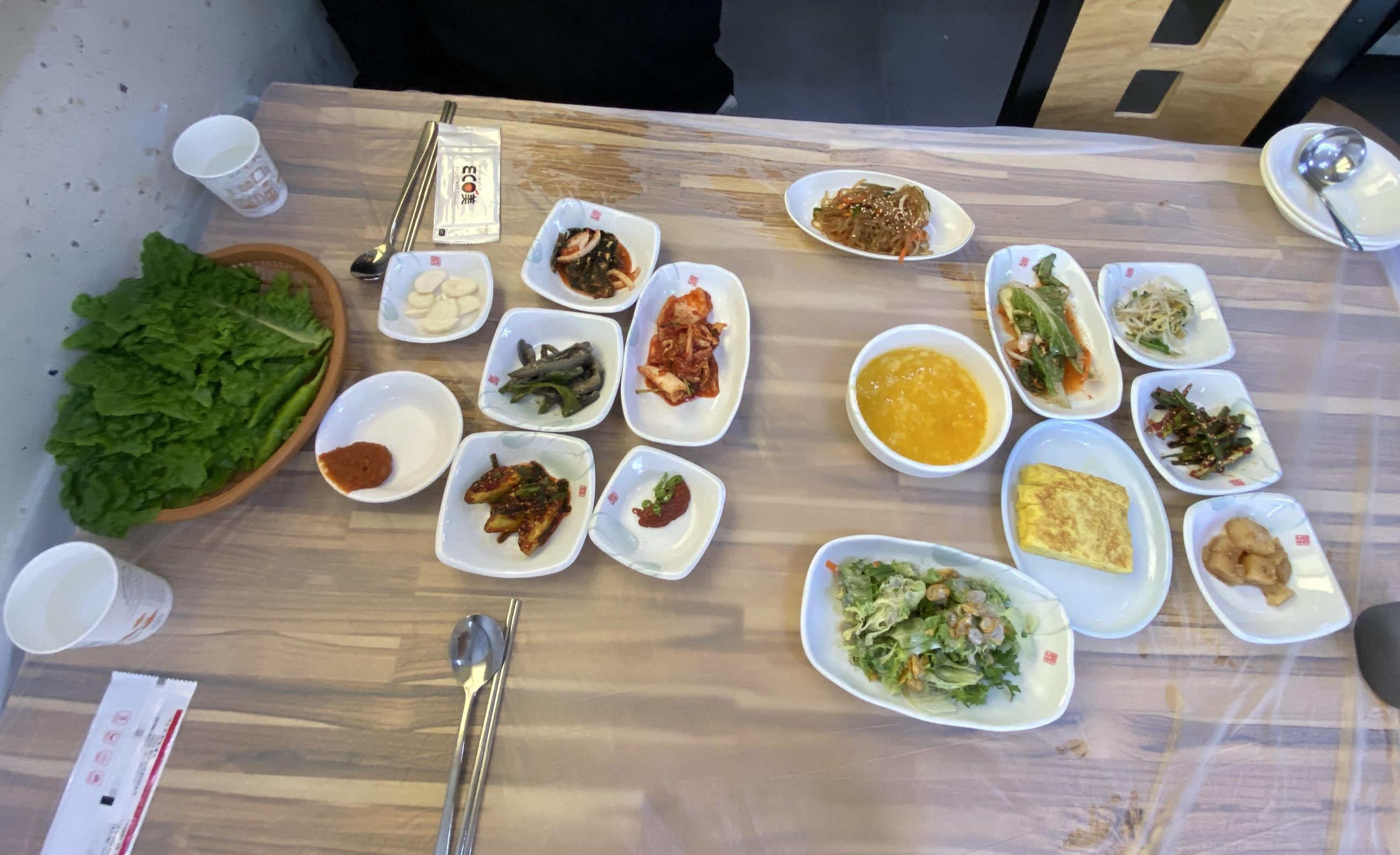이게 몇 첩인가요. 밥이 나오기 전에 샐러드랑 단호박죽을 먹습니다. 단호박죽 맛집이에요. 딱 전라도 손맛 반찬
