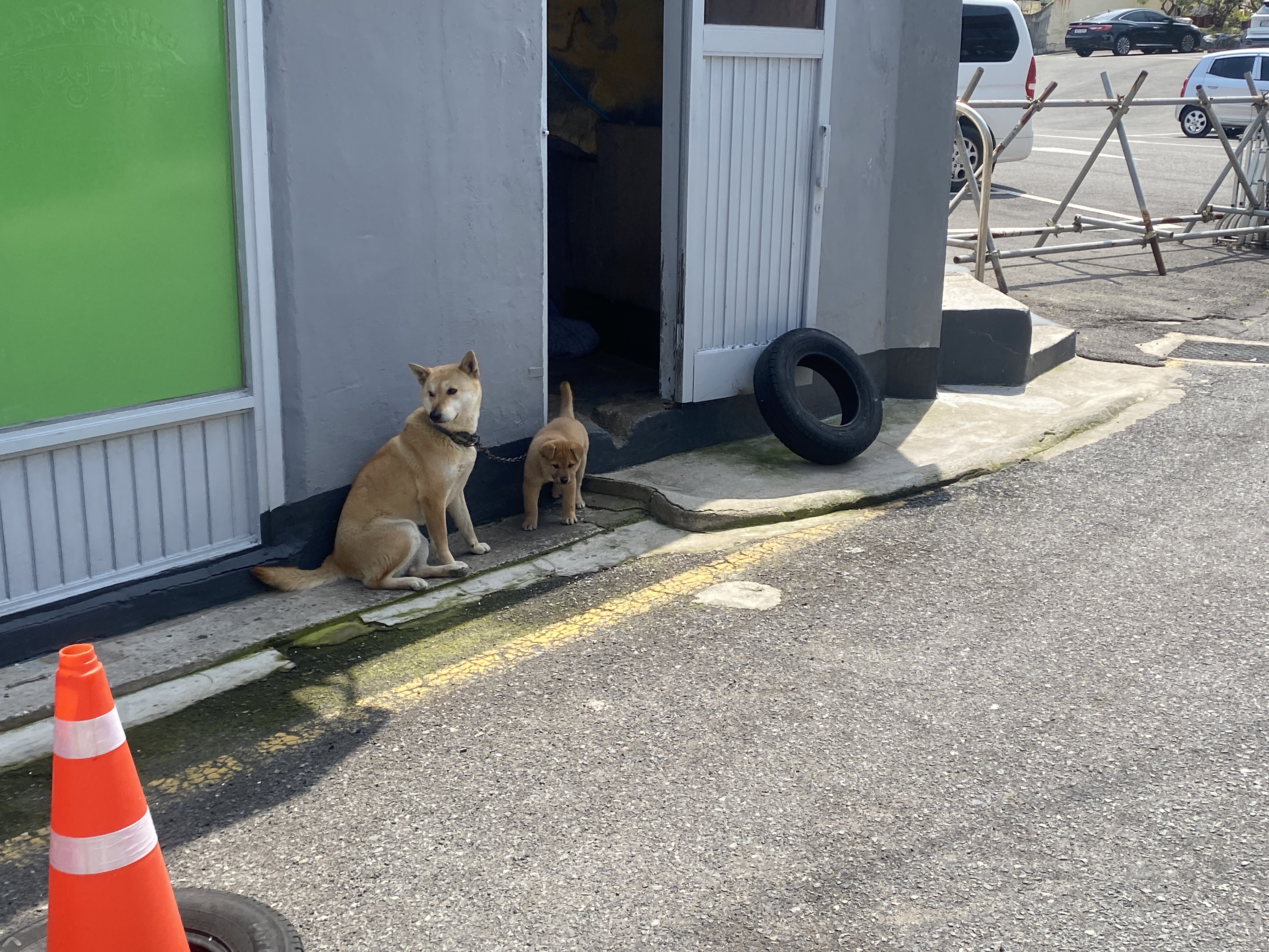 식당 앞에 이렇게 귀염뽀짝한 강아지가 있습니다. 새끼강아지 만지려고 하면 어른강아지가 먼저 예뻐해 달라고 엉덩이 들이미는 사랑둥이 구경하고 가세요