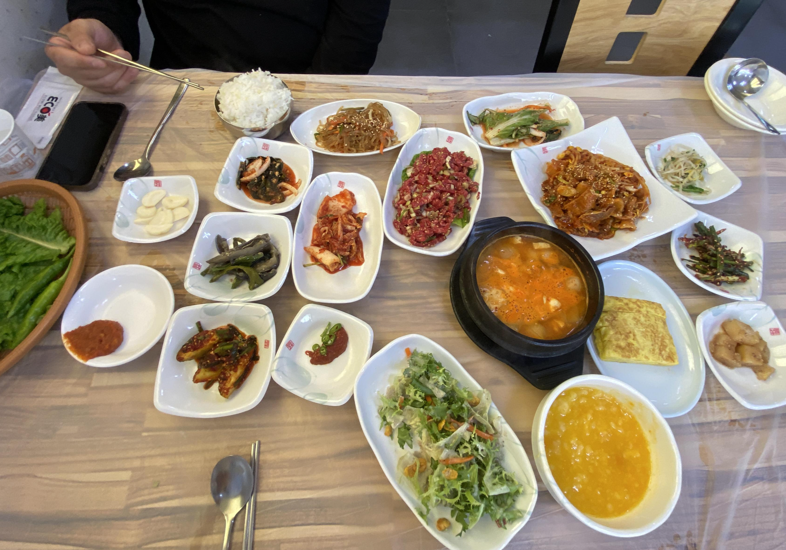 그러면 가마솥밥을 카트 끌고 다니면서 배식해 주세요. 모자라면 더 달라고 하셔도 되는데, 이미 고봉밥으로 많이 주십니다. 목포 인심 무엇. 근데 여기 진짜 육회 미쳤어요. 역 근처 백반집은 다 생선백반이라서 전 좀 별로인데 여기는 고기백반집이라 좋았습니다. 그리고 된장찌개도 맛있어요. 아쉬운 점은 계란말이랑 제육볶음은 별로였습니다. 계란은 기름 많게 부쳐서 거칠고, 제육은 콩나물이 같이 나오는 이유를 모르겠고 맛이 없어요.