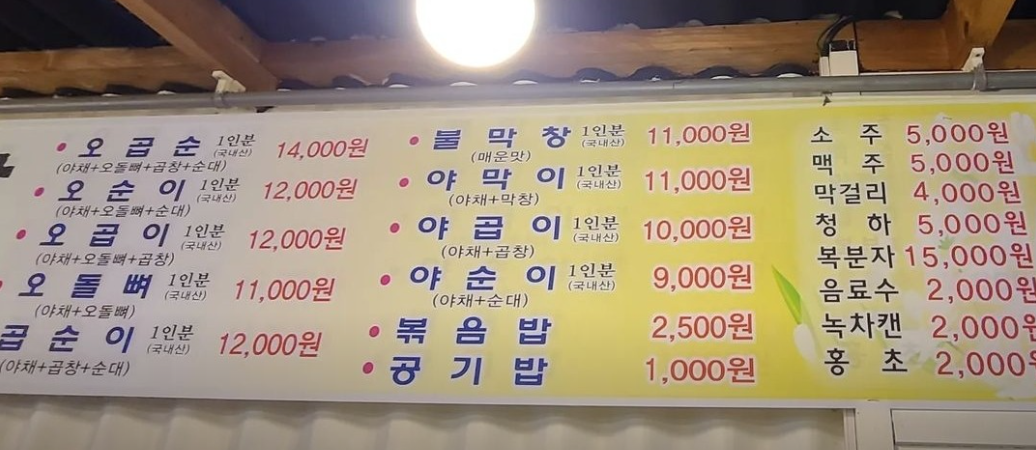 가게 입구에서 초벌 한 오곱순 등장입니다. 냄새도 안 나고 바로 먹을 수 있어서 편했습니다! 그리고 이 가성비면 조대 학생 지갑사정도 끄떡없겠어요! 실제로도 학잠입고 왔던 존잘러 조대생도 있었습니다.