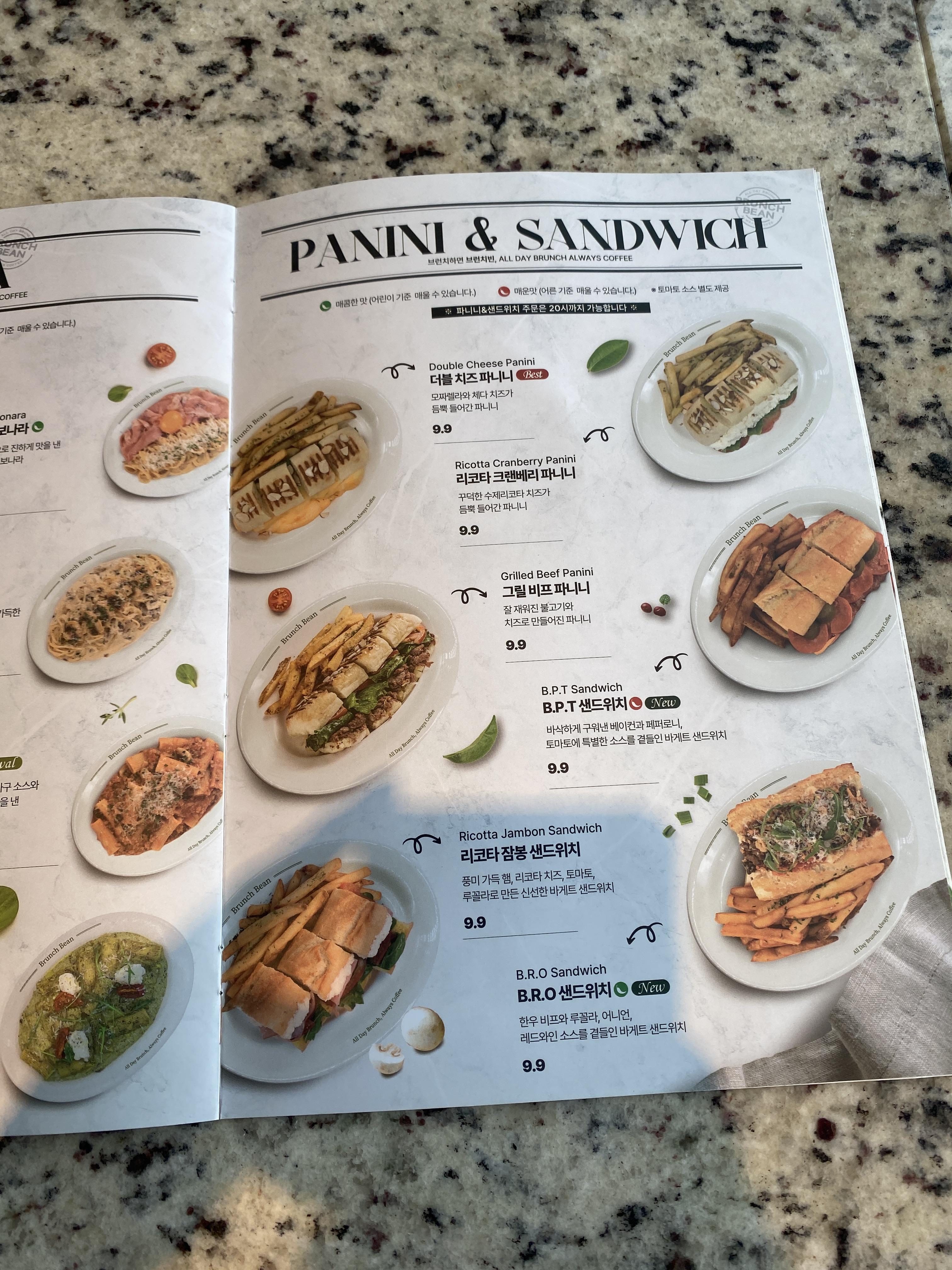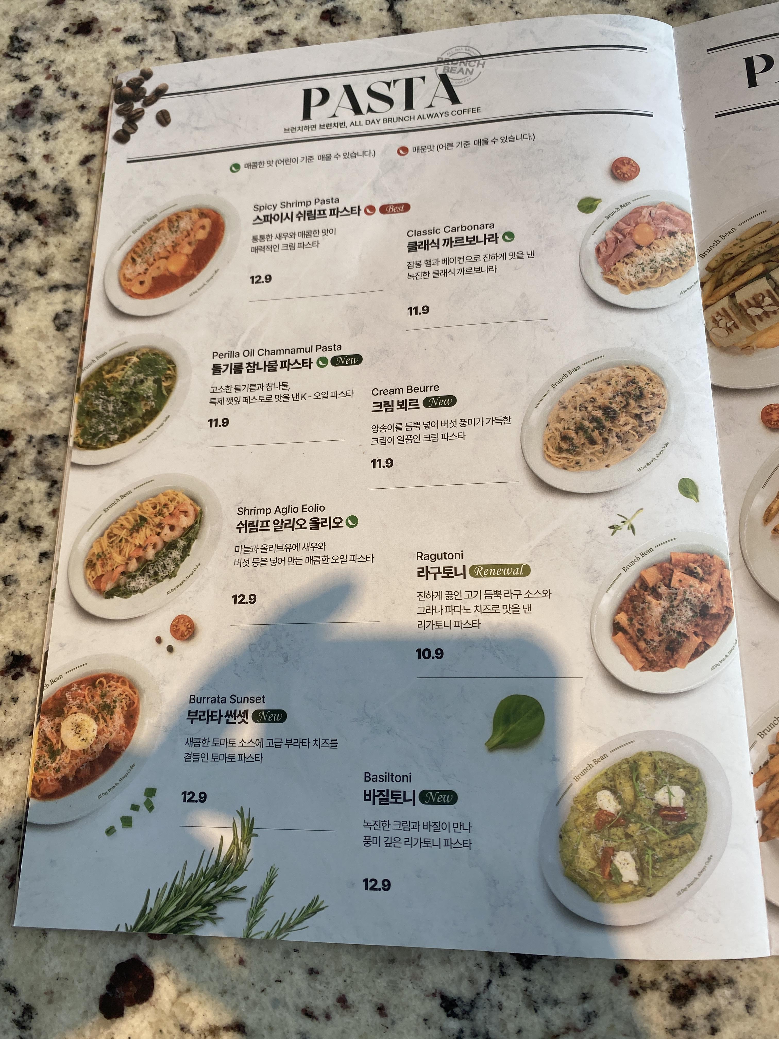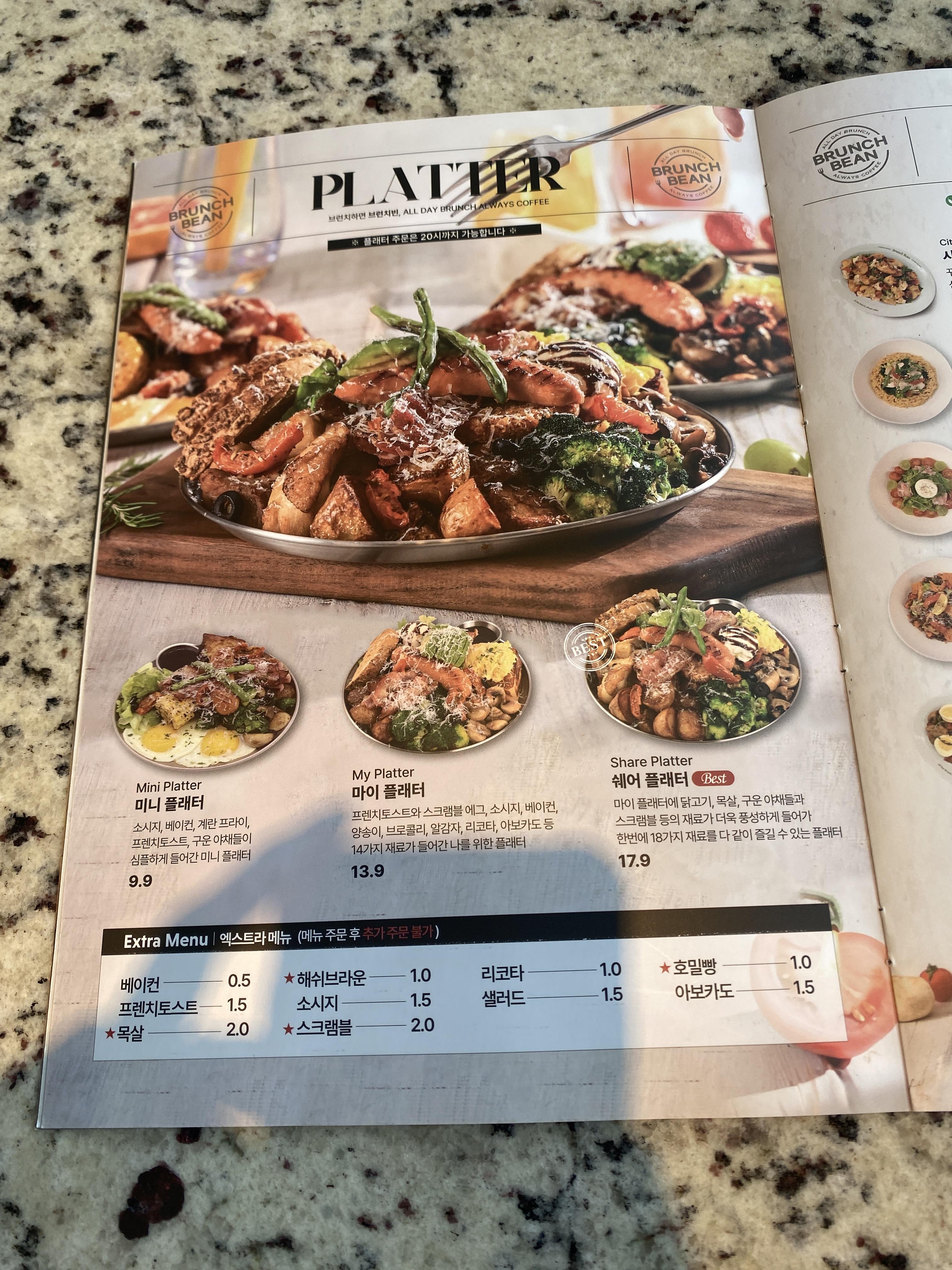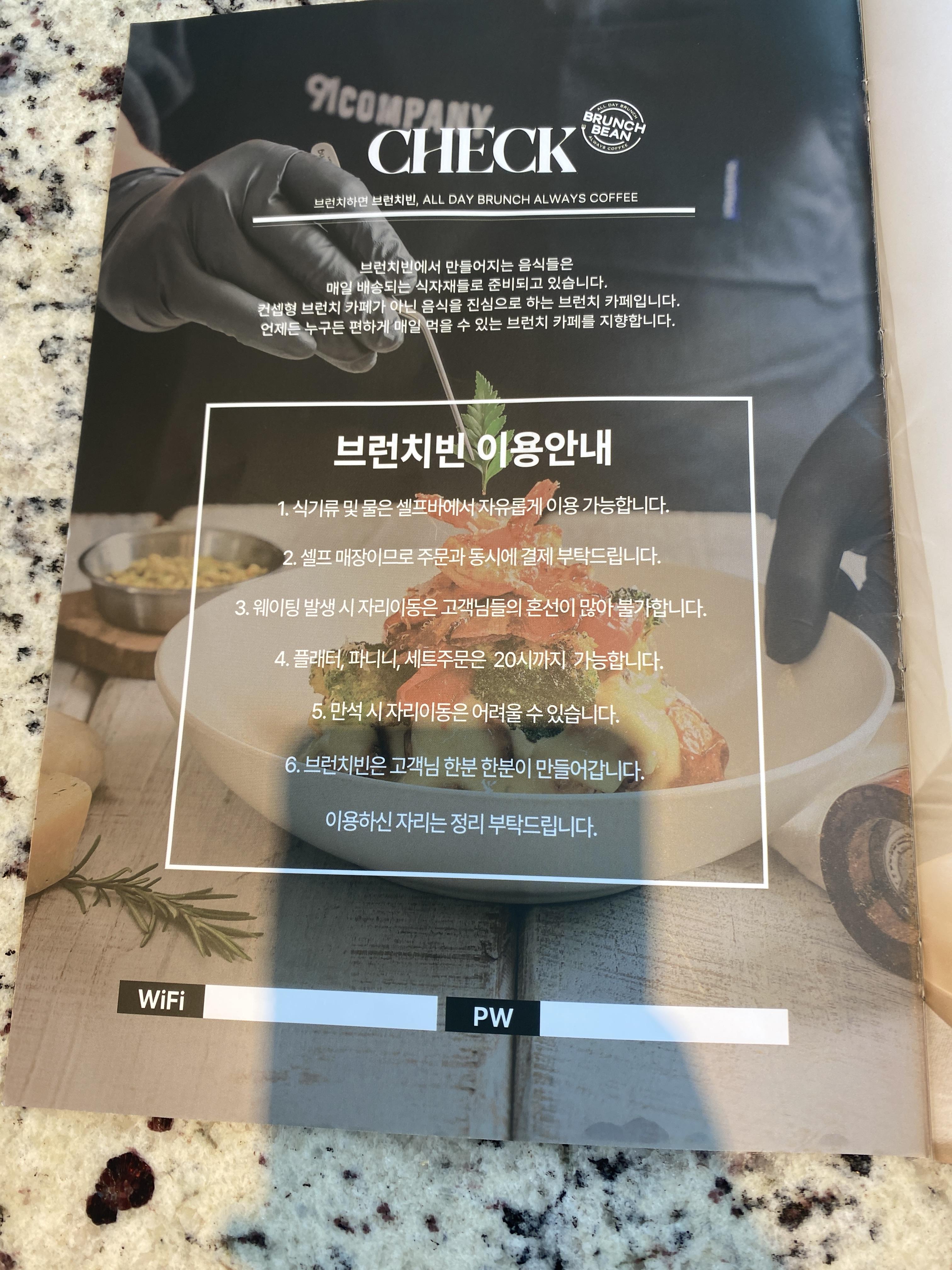테이블을 잡고 앉은 뒤 메뉴를 고릅니다. 브런치빈은 셀프매장이라 카운터에 가서 선결제 후 진동벨을 들고 돌아옵니다. 음식이 나오면 셀프바에서 식기, 물티슈, 소스, 물 등을 가져오시면 됩니다.
