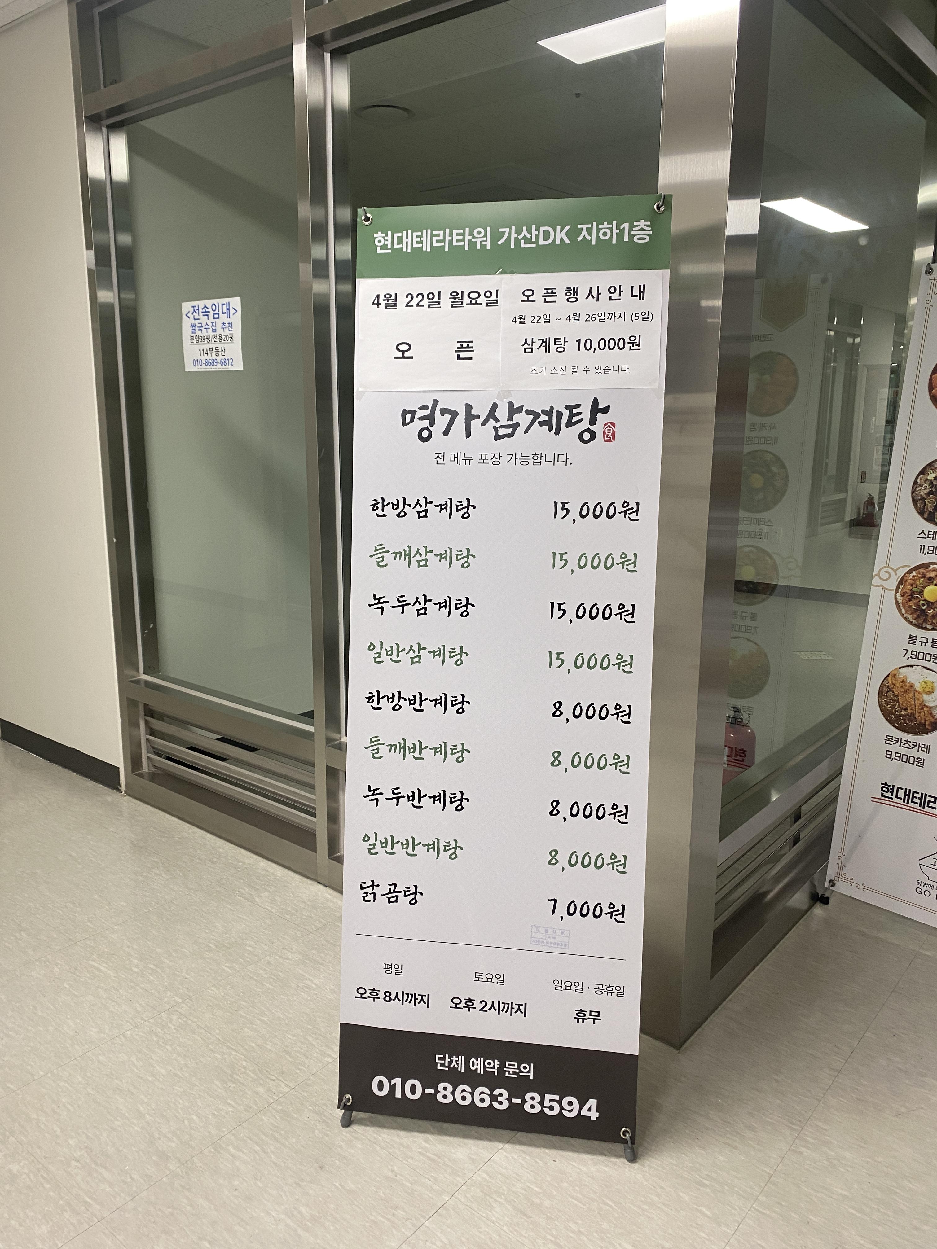 현대테라건물 지하 1층 엘베 내리면 바로 보이는 표지판이에요. 22일 오픈해서 26일까지 삼계탕을 만원에 팔고있다고 해서 허둥지둥 내려갑니다.