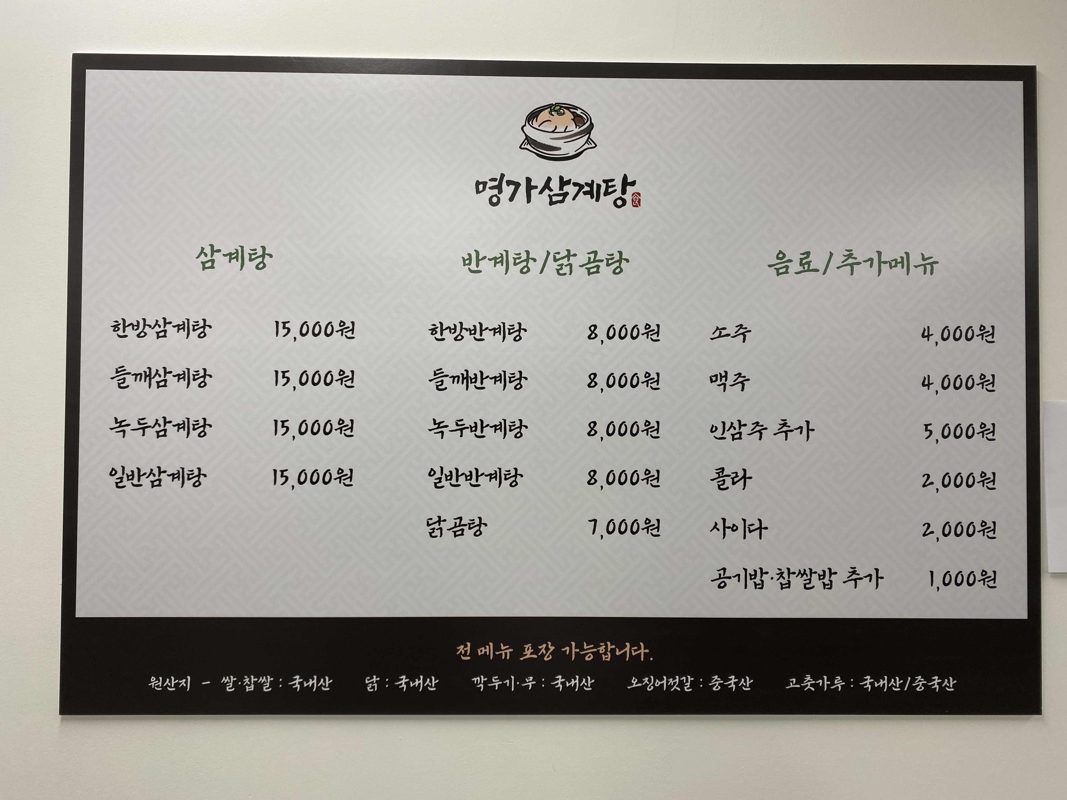 요새 느낌이 낭낭한 메뉴판을 보고 주문을 해봅니다. 삼계탕은 한방, 들깨, 녹두, 일반 4종류가 있는데 위에서부터 많이 팔린다고 했습니다. 저는 들깨삼계탕으로 포장했어요!