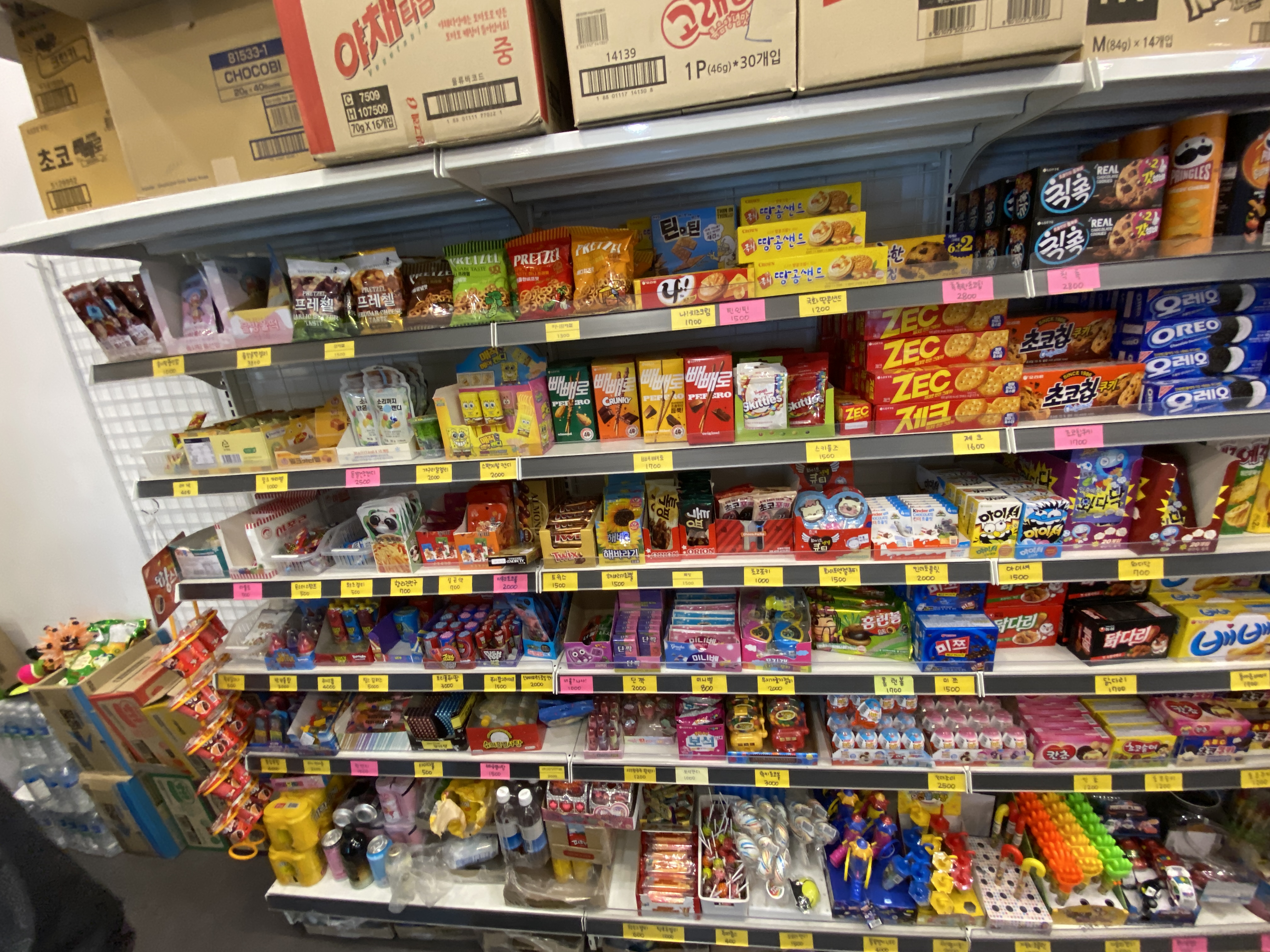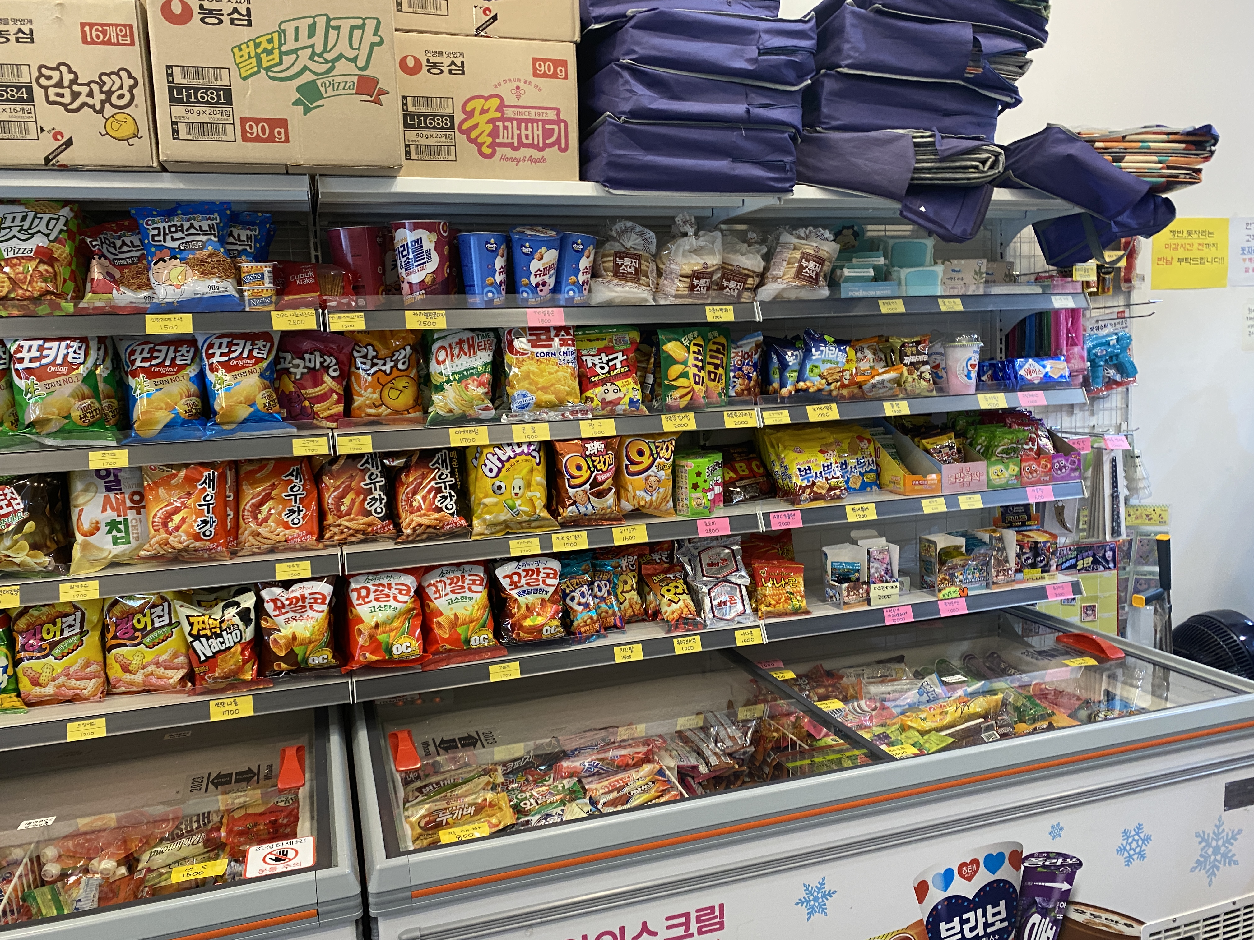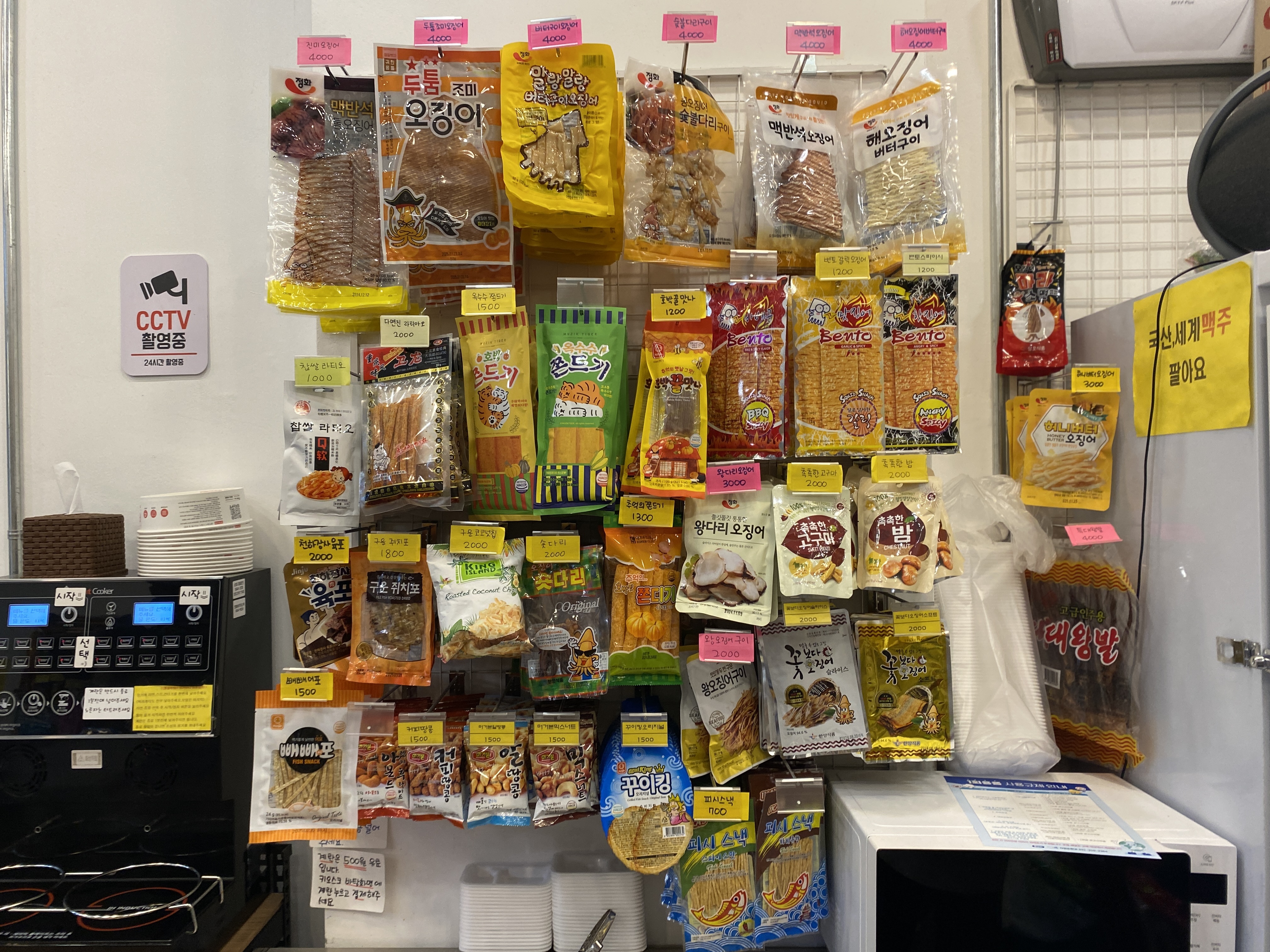 포카칩, 바나나킥, 꼬깔콘, 알새우칩,나쵸 1700원 새우깡, 콘칩, 짱구, 치킨팝 1500원 아이스크림 샌드 1500원 막대바 800원