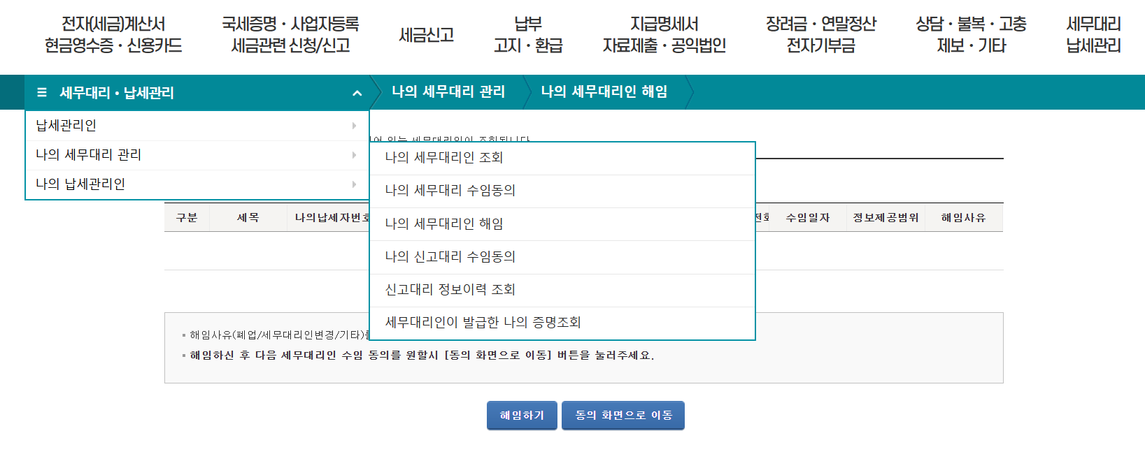 홈택스-세무대리, 납세관리 - 나의 세무대리관리 - 나의 세무대리인 해임